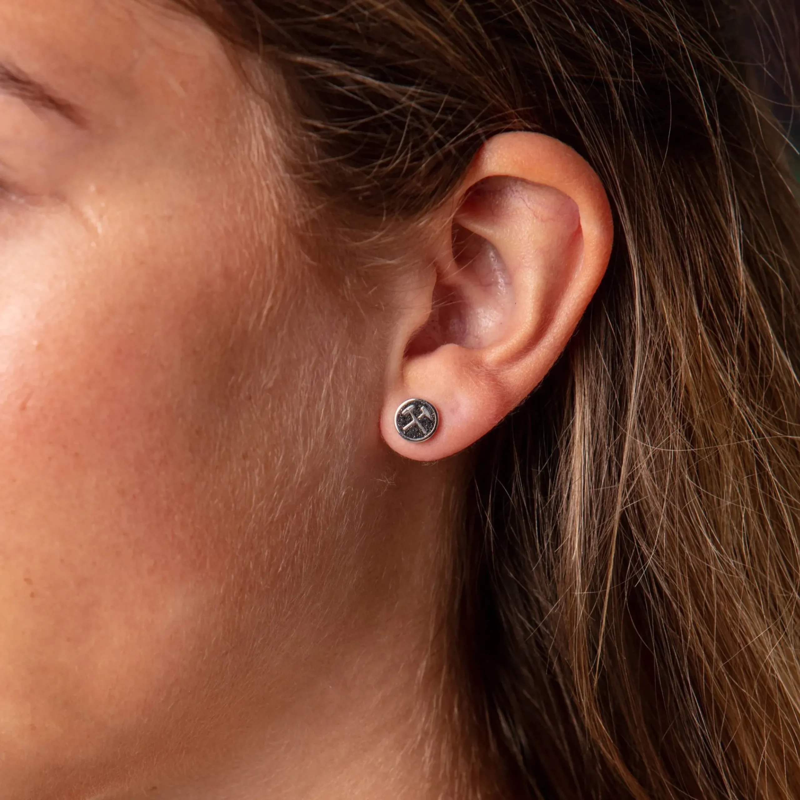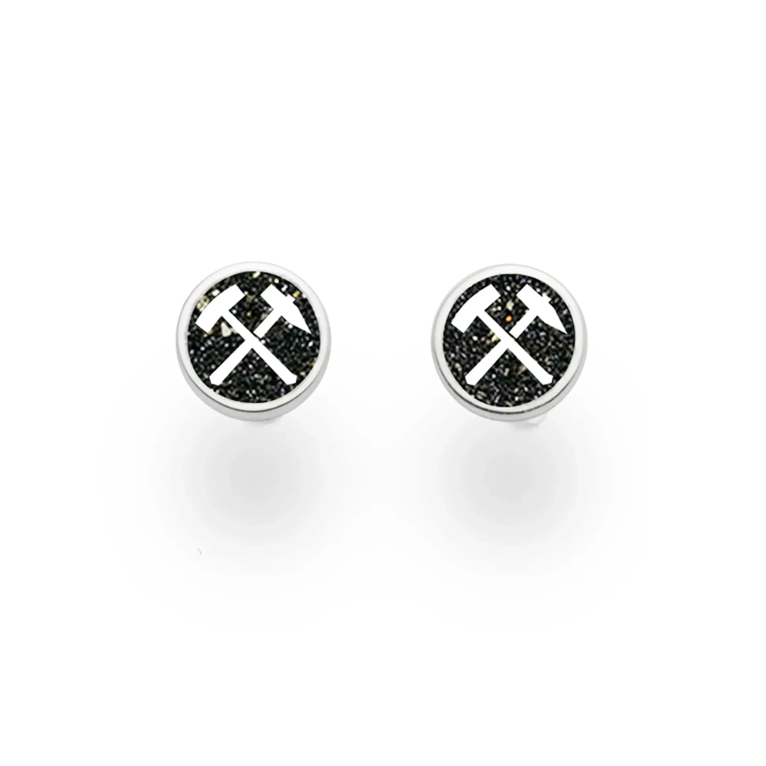 Ohrring „Schlägel & Eisen“, kleiner 8 mm runder Ohrstecker mit Schlägel & Eisen, eingebettet in Lavasand und gefaßt in rhodiniertem 925er Sterlingsilber.