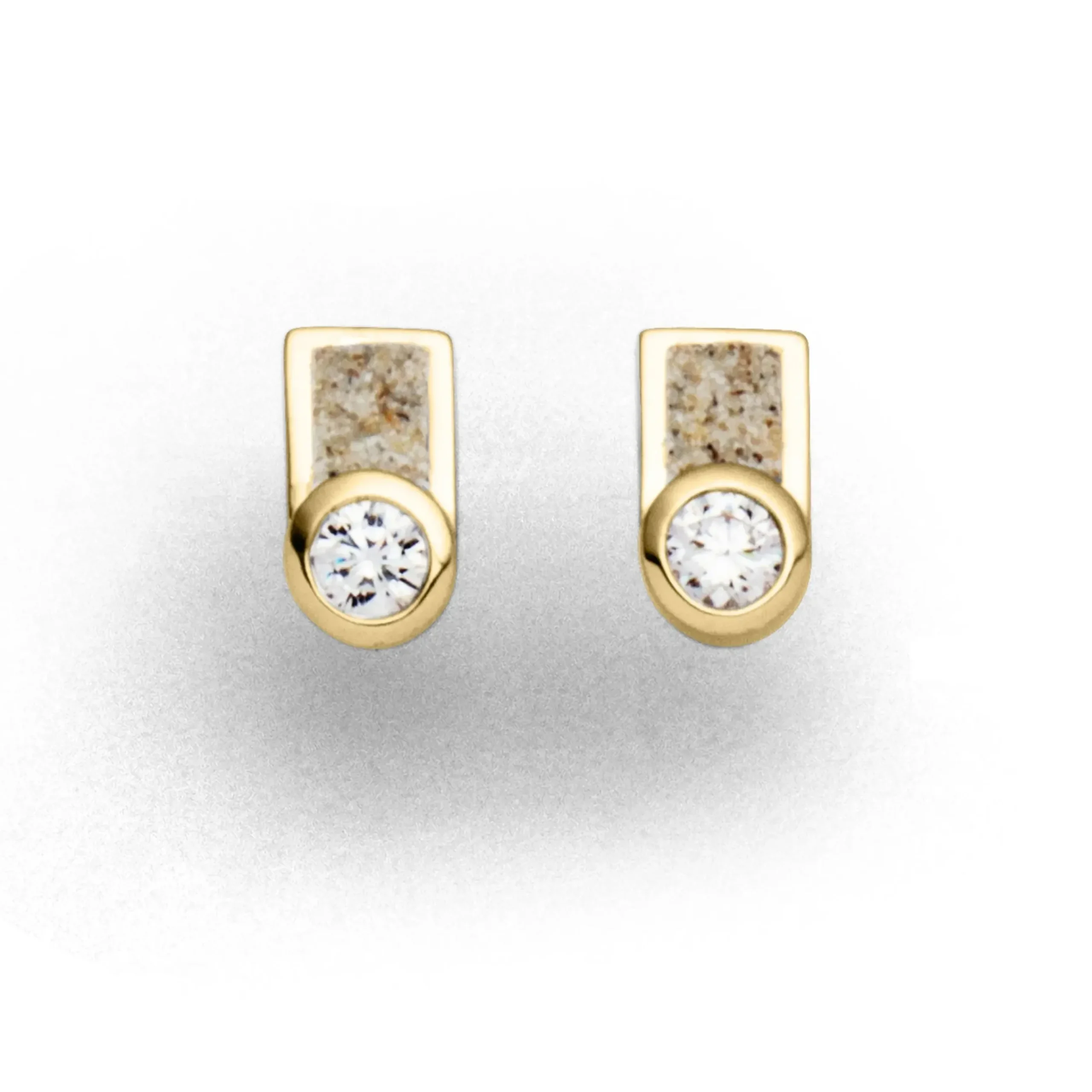 Zierlicher, eckiger Ohrring „Venus“, gefüllt mit Strandsand, der durch die Kombination mit einem kleinen Zirkoniastein am unteren Rand wie der hellste Planet am Himmel, die „Venus“ erstrahlt. Alles gefasst in vergoldetem 925er Sterlingsilber.