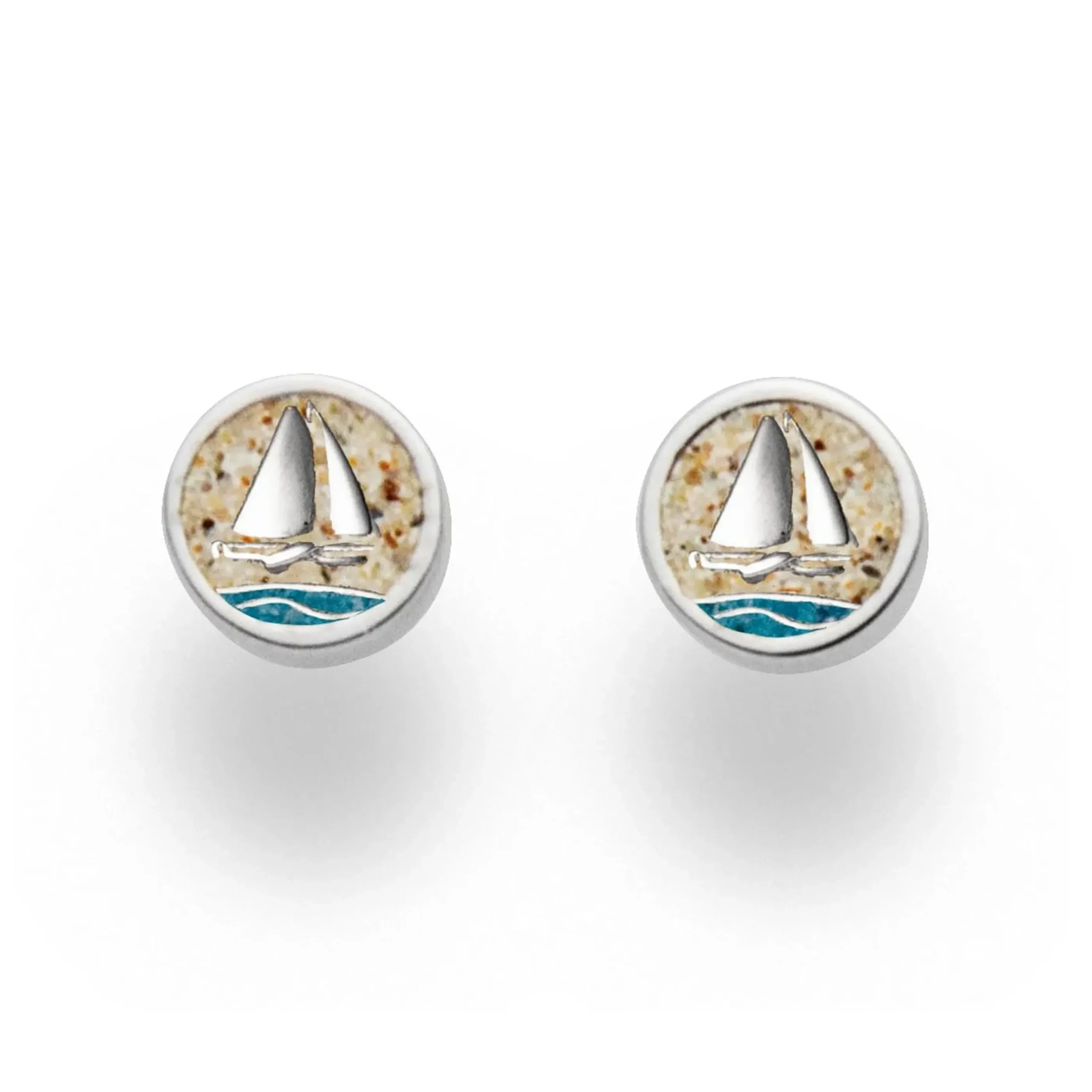 Ohrstecker „Ahoi“, kleiner runder Ohrstecker mit einem Plattbodenschiff und Wellen, in Strandsand und blauen Steinsand eingebettet und gefaßt in rhodiniertem 925er Silber