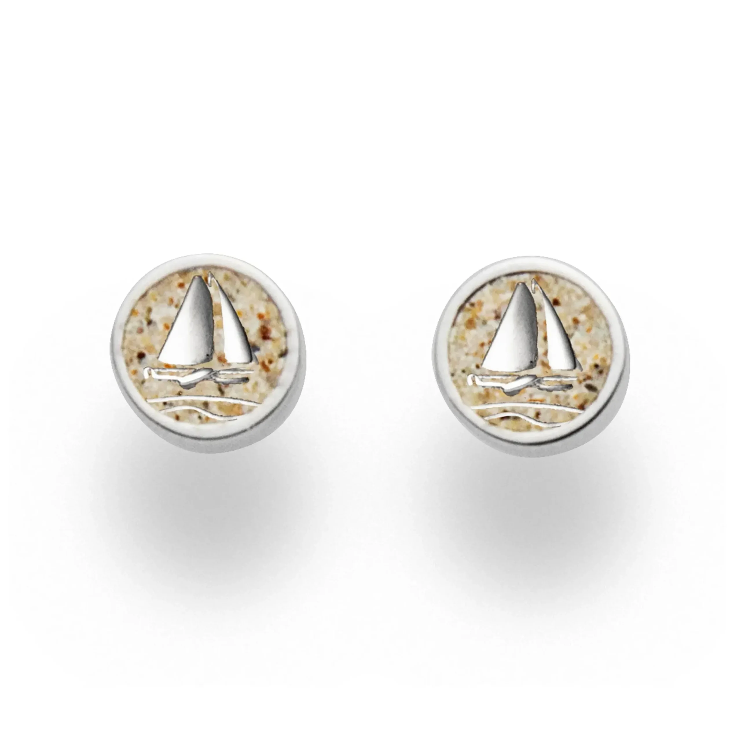 Ohrstecker „Ahoi“, kleiner runder Ohrstecker mit einem Plattbodenschiff und Wellen, in Strandsand eingebettet und gefaßt in rhodiniertem 925er Silber