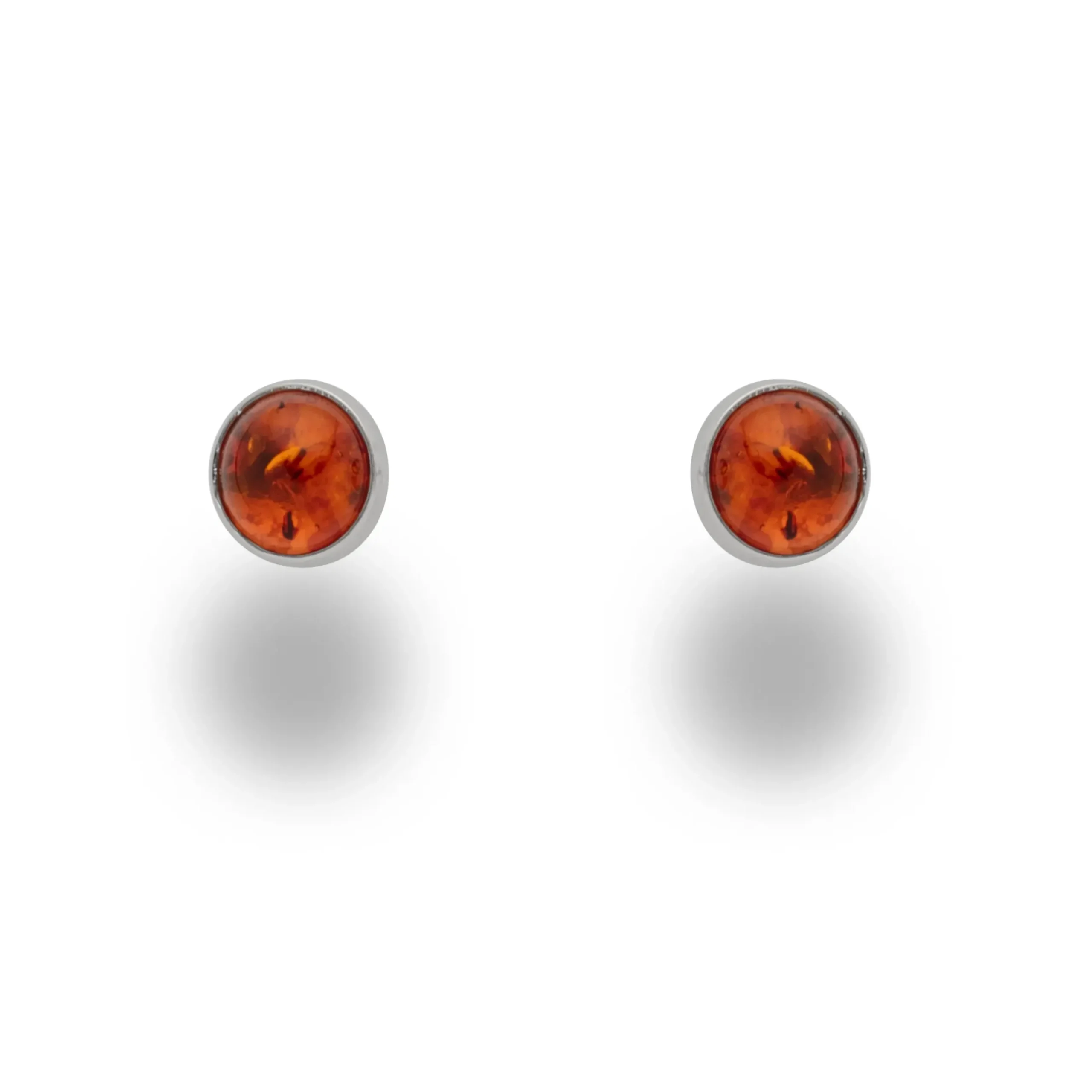 Kleiner runder Ohrstecker mit einem 6 mm Bernstein gewölbt, gefasst in rhodiniertem, poliertem 925er Sterlingsilber. Durch die Rhodinierung ist das Schmuckstück anlaufgeschützt.