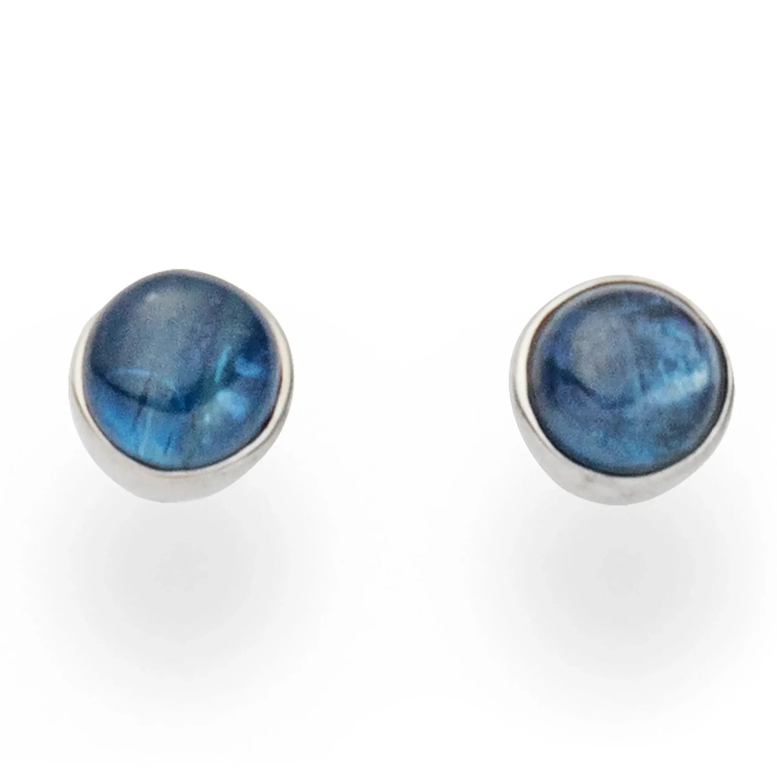Kleiner runder Ohrstecker mit einem blauen Kyanitstein gewölbt, gefaßt in rhodiniertem 925er Sterlingsilber