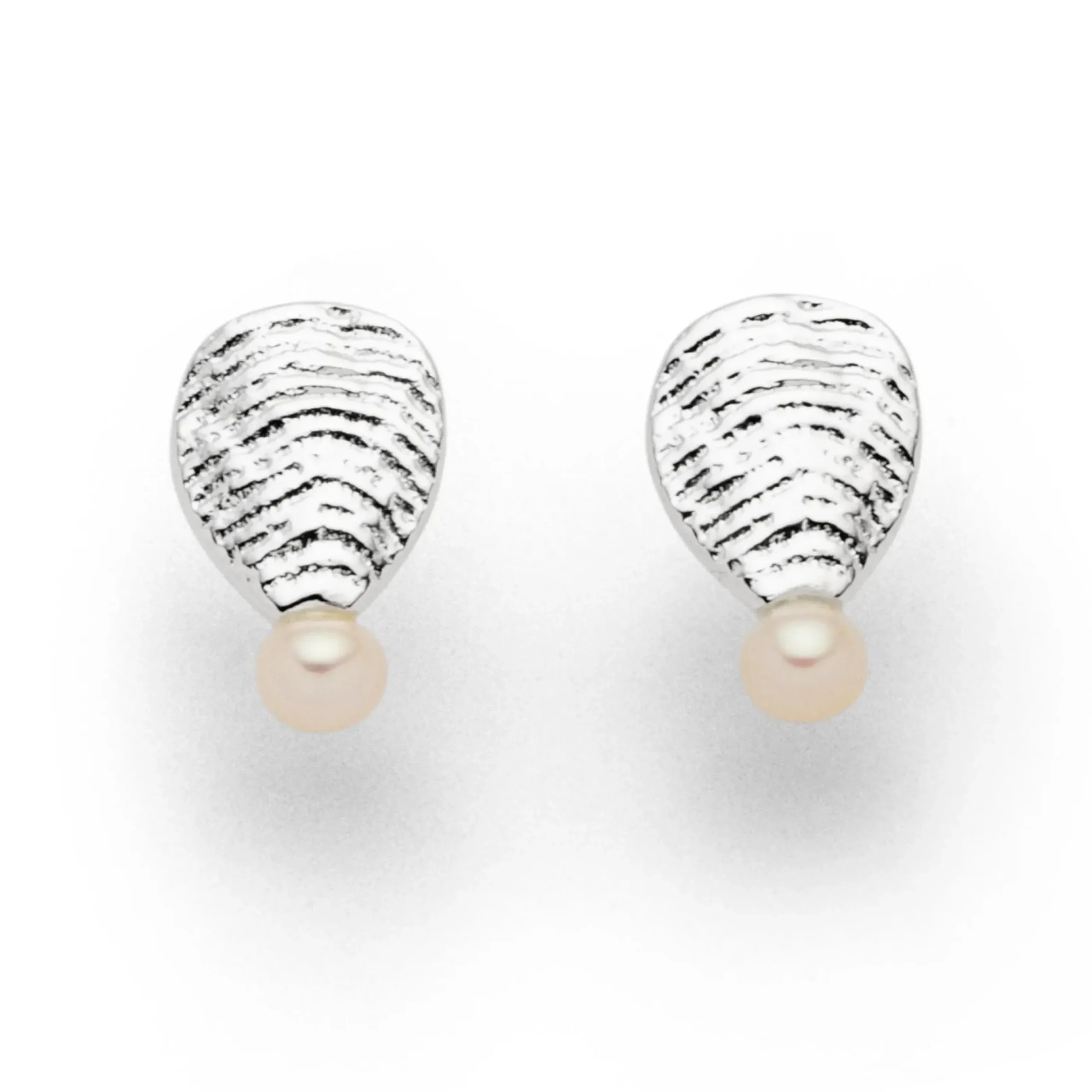 Ohrstecker „Perlenbucht“, wellenförmig strukturiert und verziert mit einer 5 mm Süßwasserperle, alles aus poliertem und anlaufgeschützem (e-coating) 925er Sterling-Silber