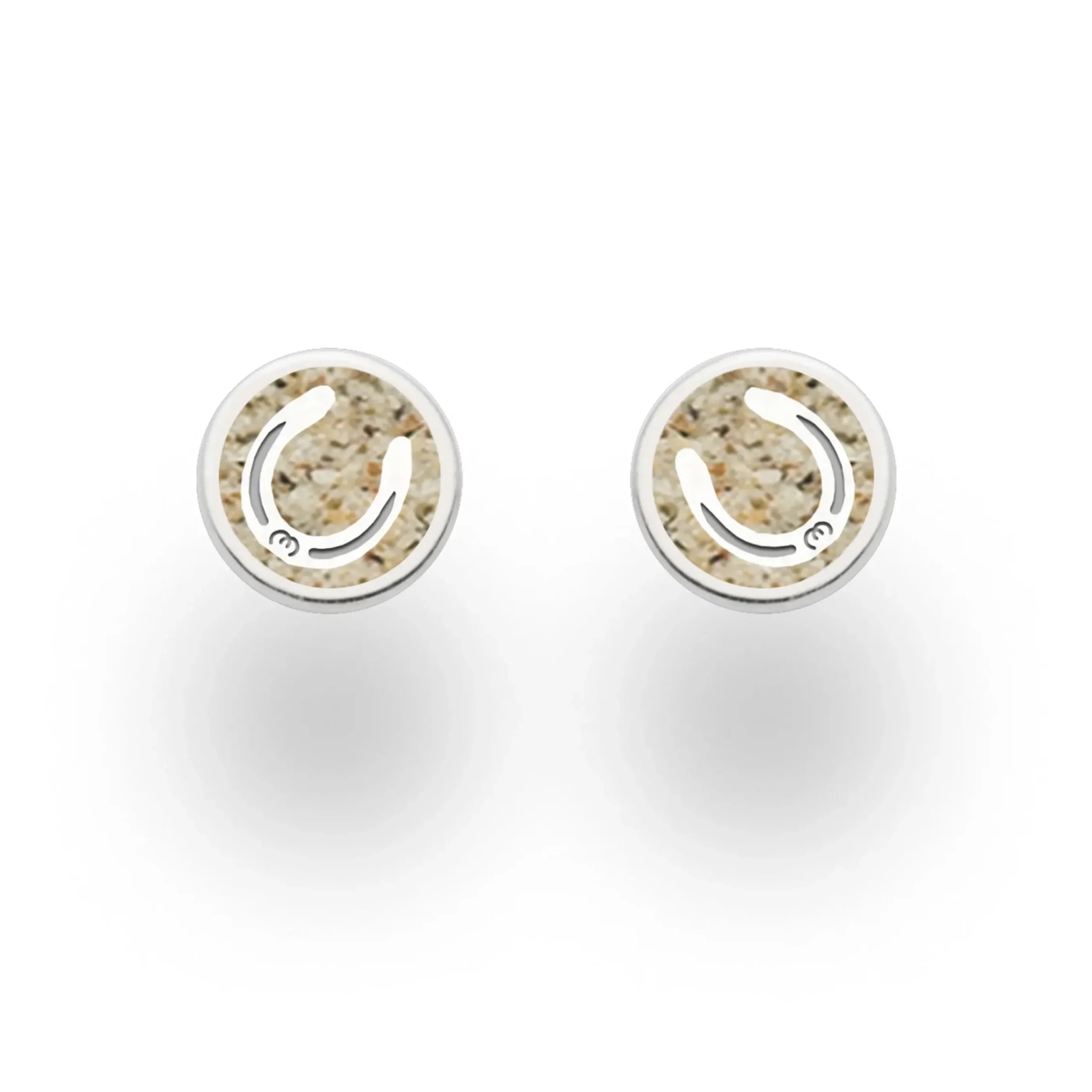 Runder Ohrstecker Pferdeglück „Hufeisen“ gefüllt mit Strandsand und einem Hufeisen aus Silber, gefasst in rhodiniertem 925er Silber