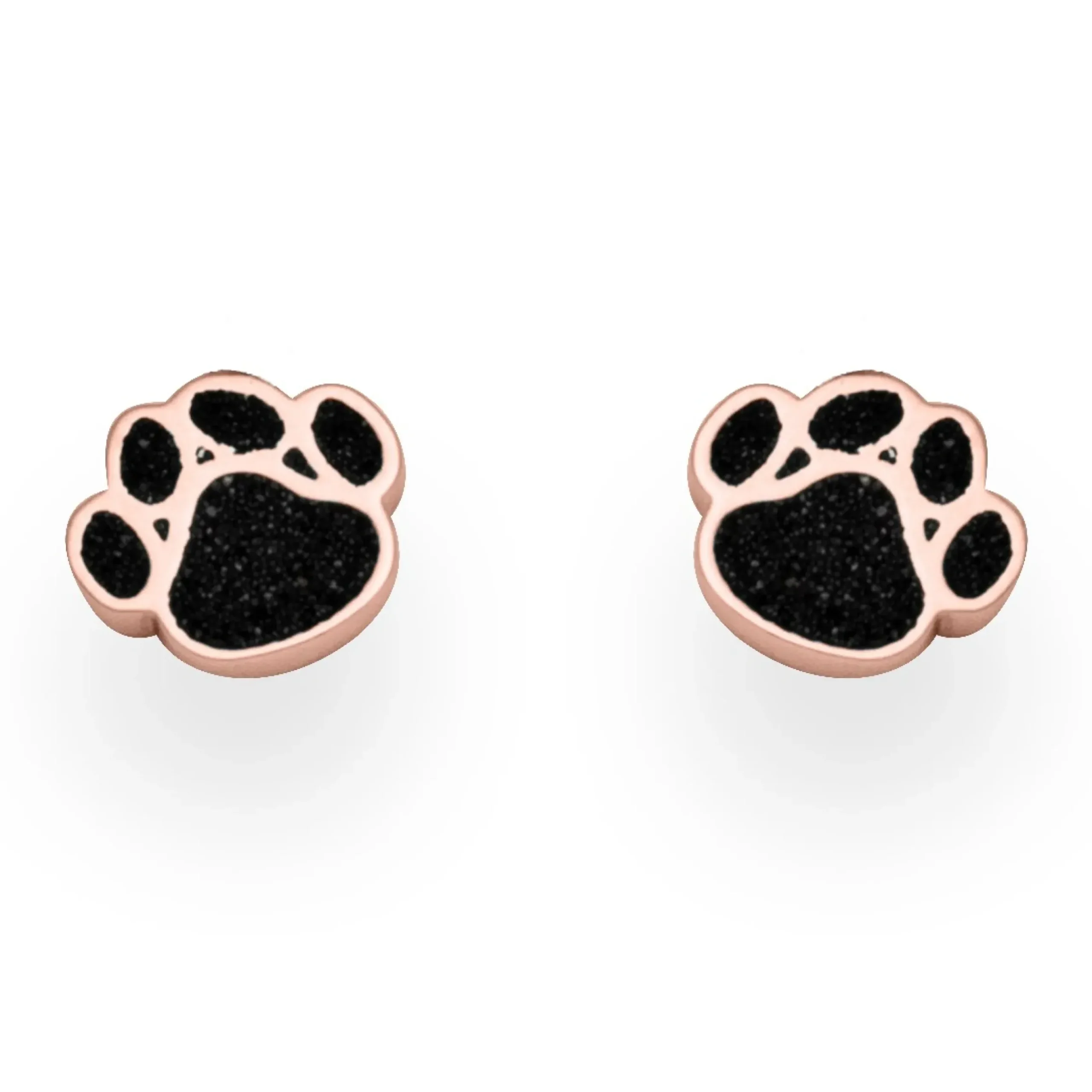 Kleiner flacher Ohrstecker in Form einer Hundepfote, mit Lavasand gefüllt. Die Fassung ist aus rose vergoldetem 925er Sterling-Silber gefertigt.