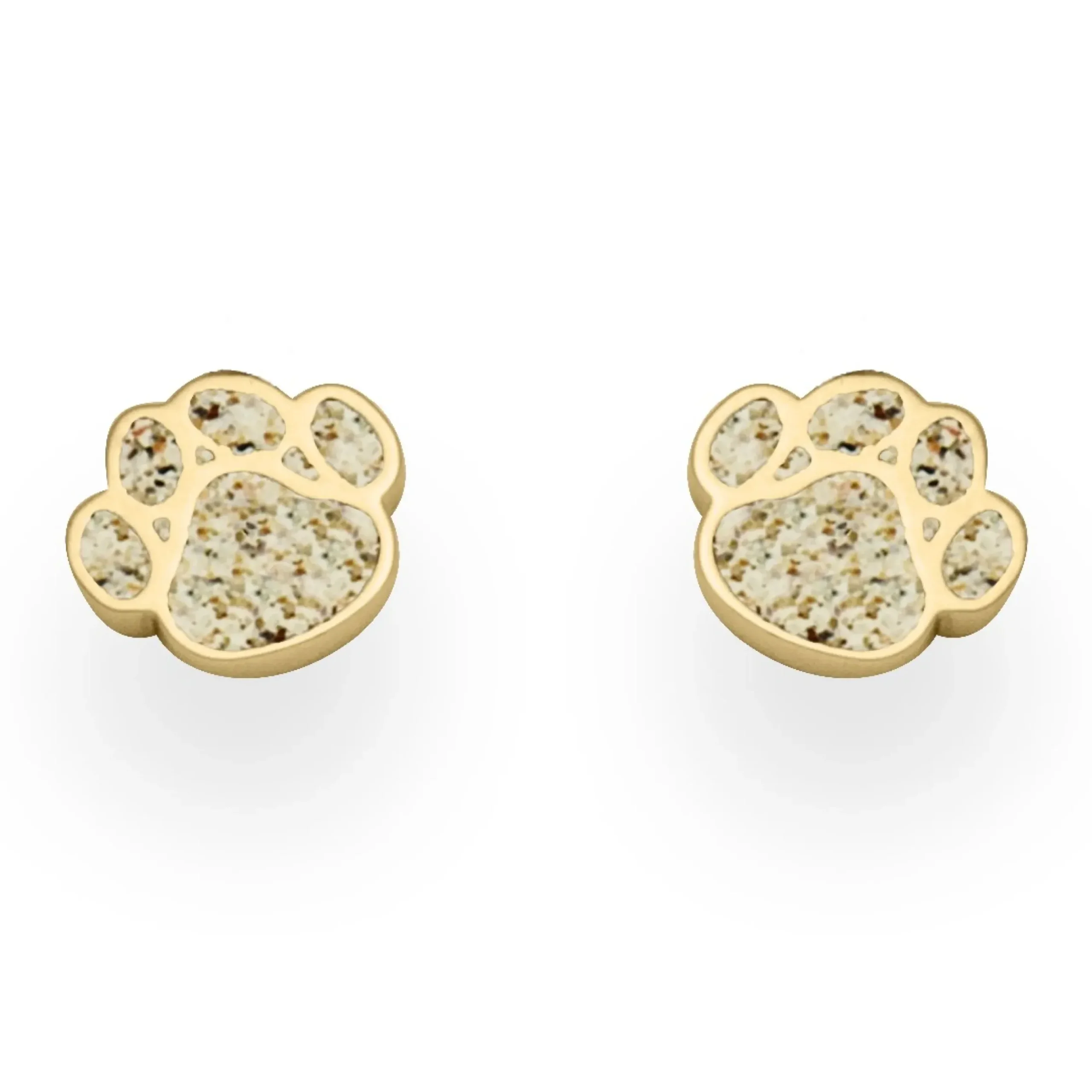 Kleiner flacher Ohrstecker in Form einer Hundepfote, mit Strandsand gefüllt. Die Fassung ist aus vergoldetem 925er Sterling-Silber gefertigt.
