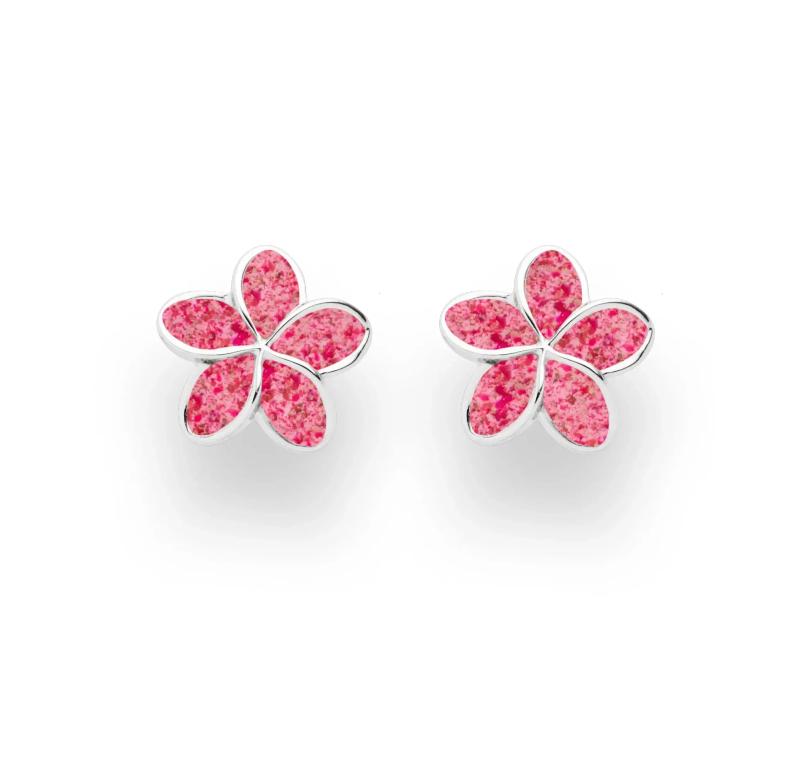 Echte Sehnsucht: Ohrstecker „Plumeria Blüte“, gefüllt mit rosa Steinsand, alles aus poliertem und rhodiniertem 925er Sterling-Silber.