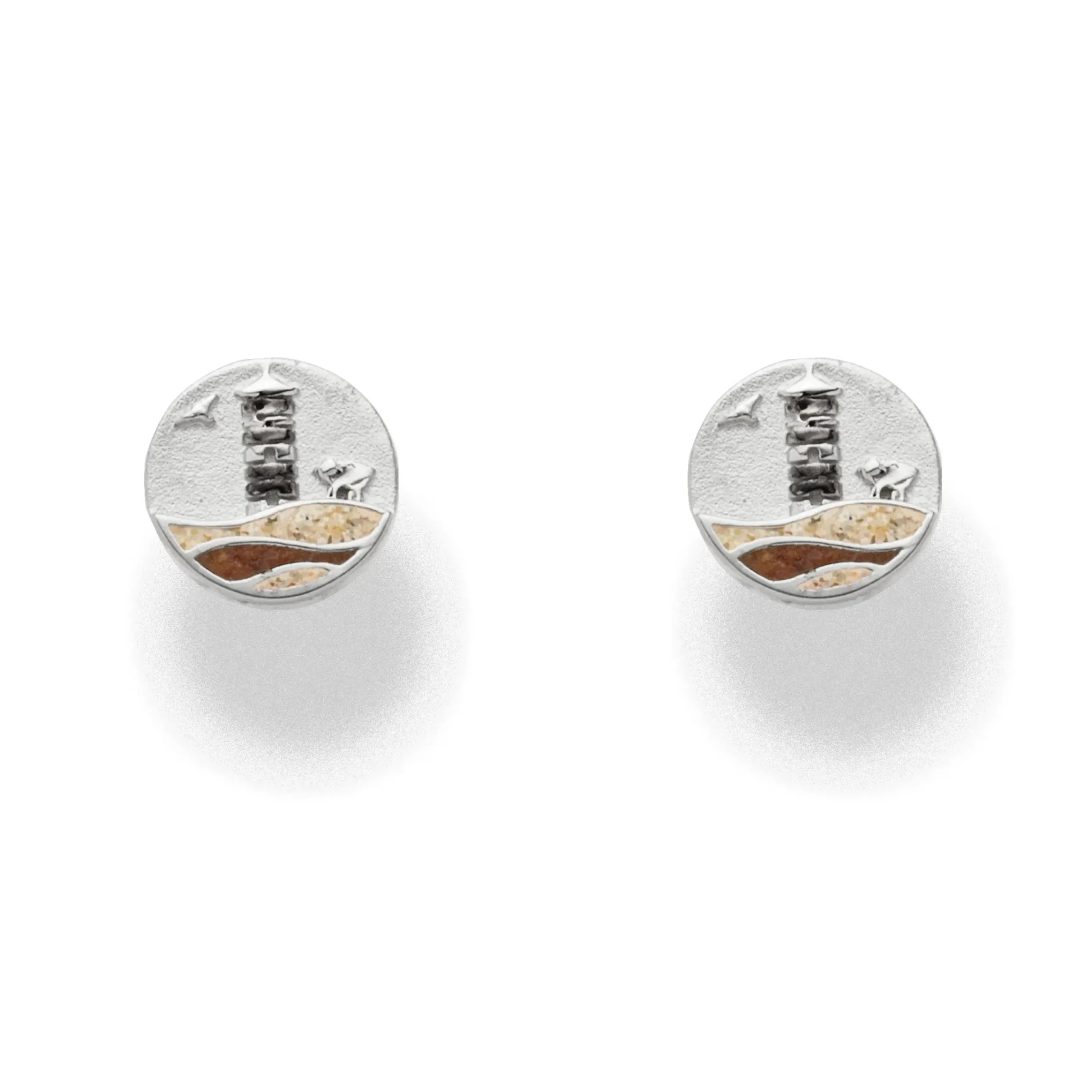 Ohrstecker rund, Strandwellen „Pilsumer Leuchtturm“ mit dem bekannten Motiv aus Ostfriesland: Otto-Turm, Schaf und einer Möwe, die Wellen sind eingebettet in Strandsand und Bernsteinsand, alles gefasst in poliertem, rhodiniertem 925er Sterling-Silber.