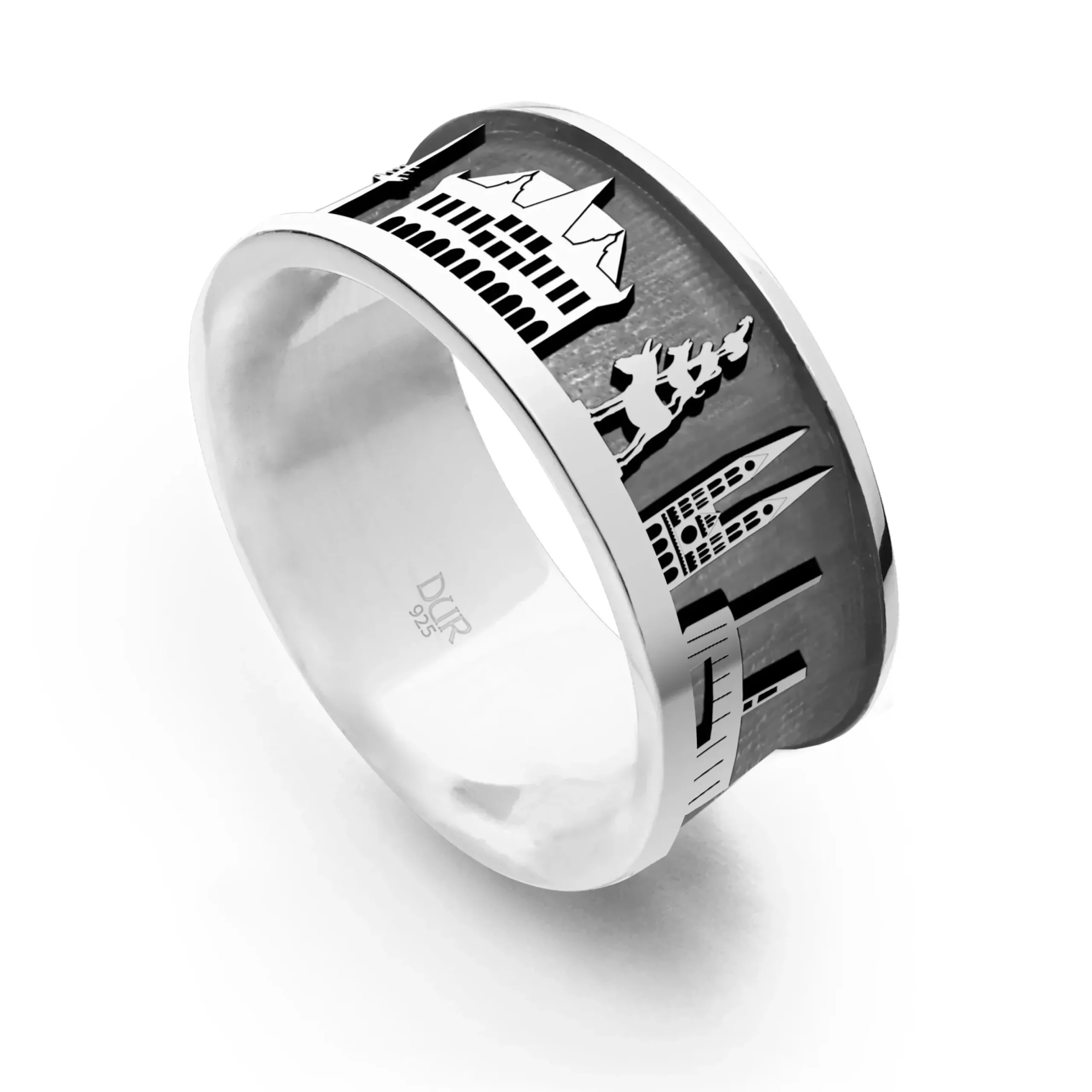 Stadtring „Bremen“ Premiumausführung mit den silbernen Motiven: Universum, Fernmeldeturm, Rathaus, Bremer Stadtmusikanten, Dom, Weserstadion, Roland, innen dunkel rhodiniert, alles aus rhodiniertem 925er Sterling-Silber