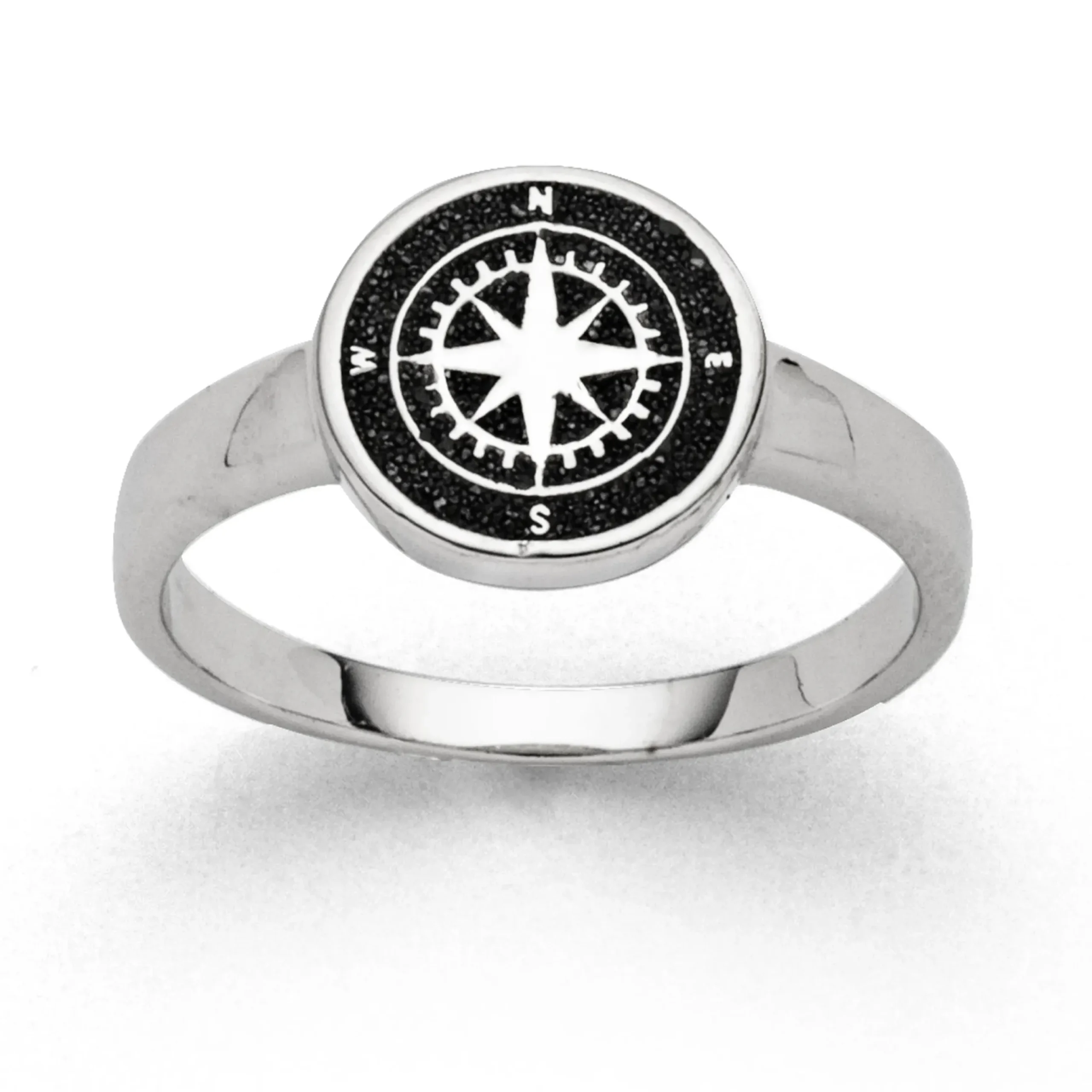 Ring „Kompass“, mit einer Kompassrose, eingebettet in Lavasand, gefaßt in rhodiniertem 925er Sterlingsilber. Durch die Rhodinierung ist das Schmuckstück anlaufgeschützt.