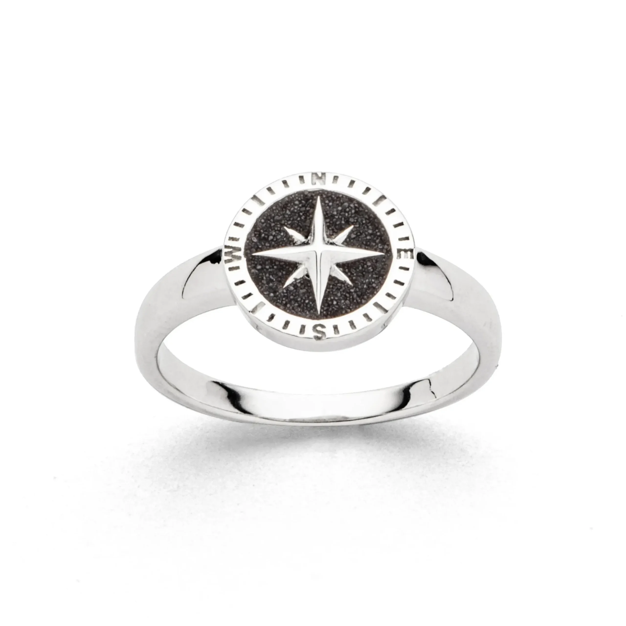 Runder Ring „Kompassrose 2.0“ mit Lavasand gefüllt, aus poliertem, rhodiniertem 925er Sterling-Silber