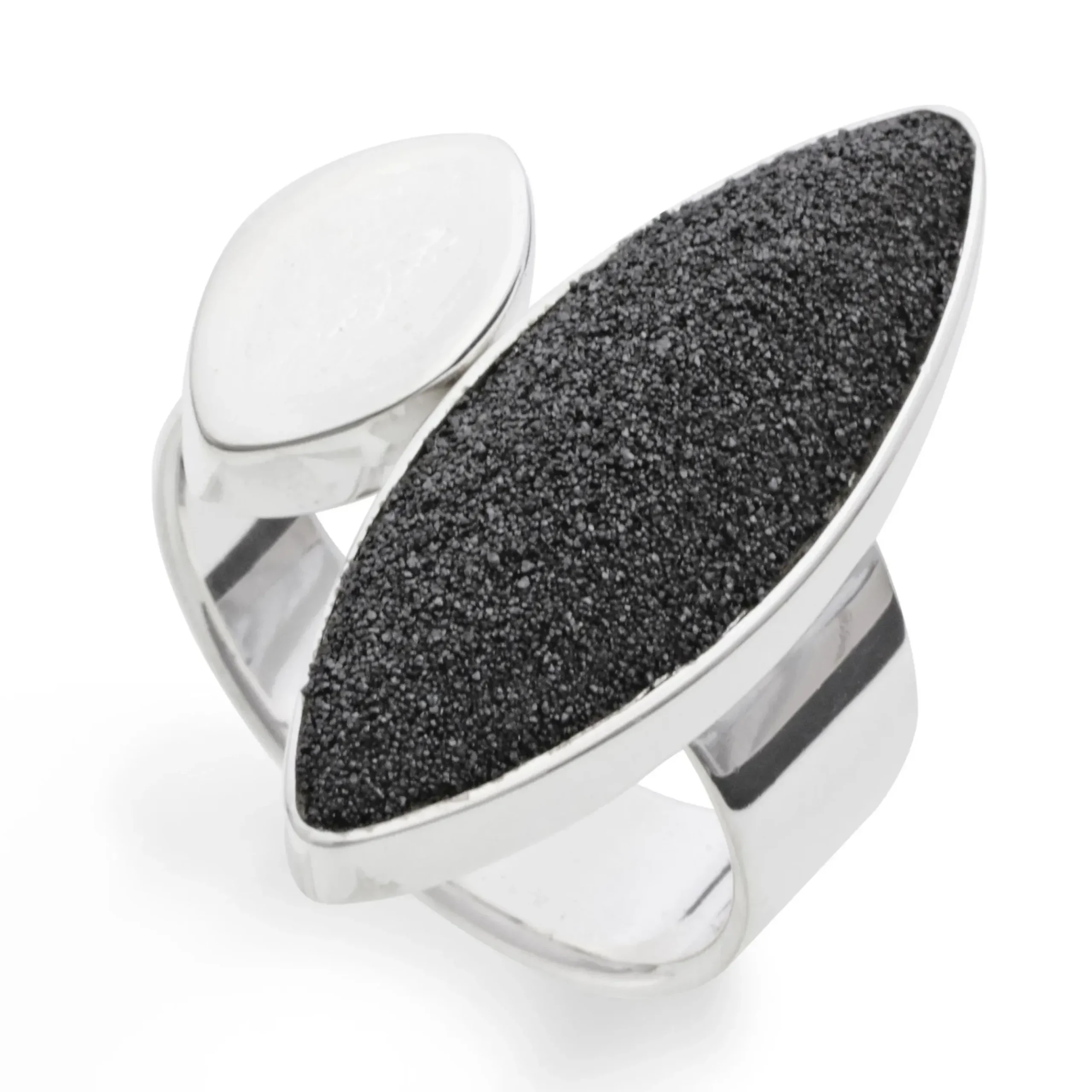 Ring mit einem länglichen Lavasand -Element und einem kleinen länglichen gebürsteten Silberelement, oben offen aus rhodiniertem 925er Sterling-Silber