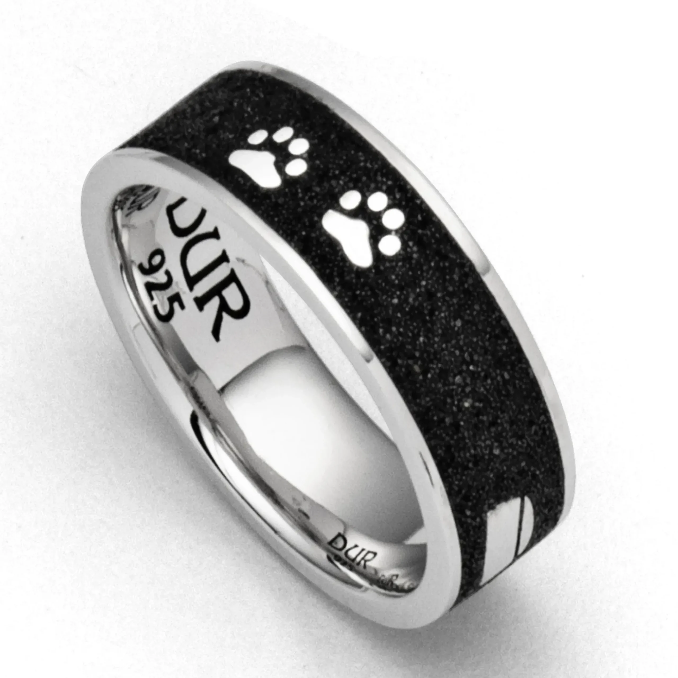 Schmaler Bandring „Lucky Dog 2.0“ mit Hundepfoten, Napf und Knochen eingearbeitet in Lavasand und gefasst in poliertem und rhodiniertem 925er Sterling-Silber