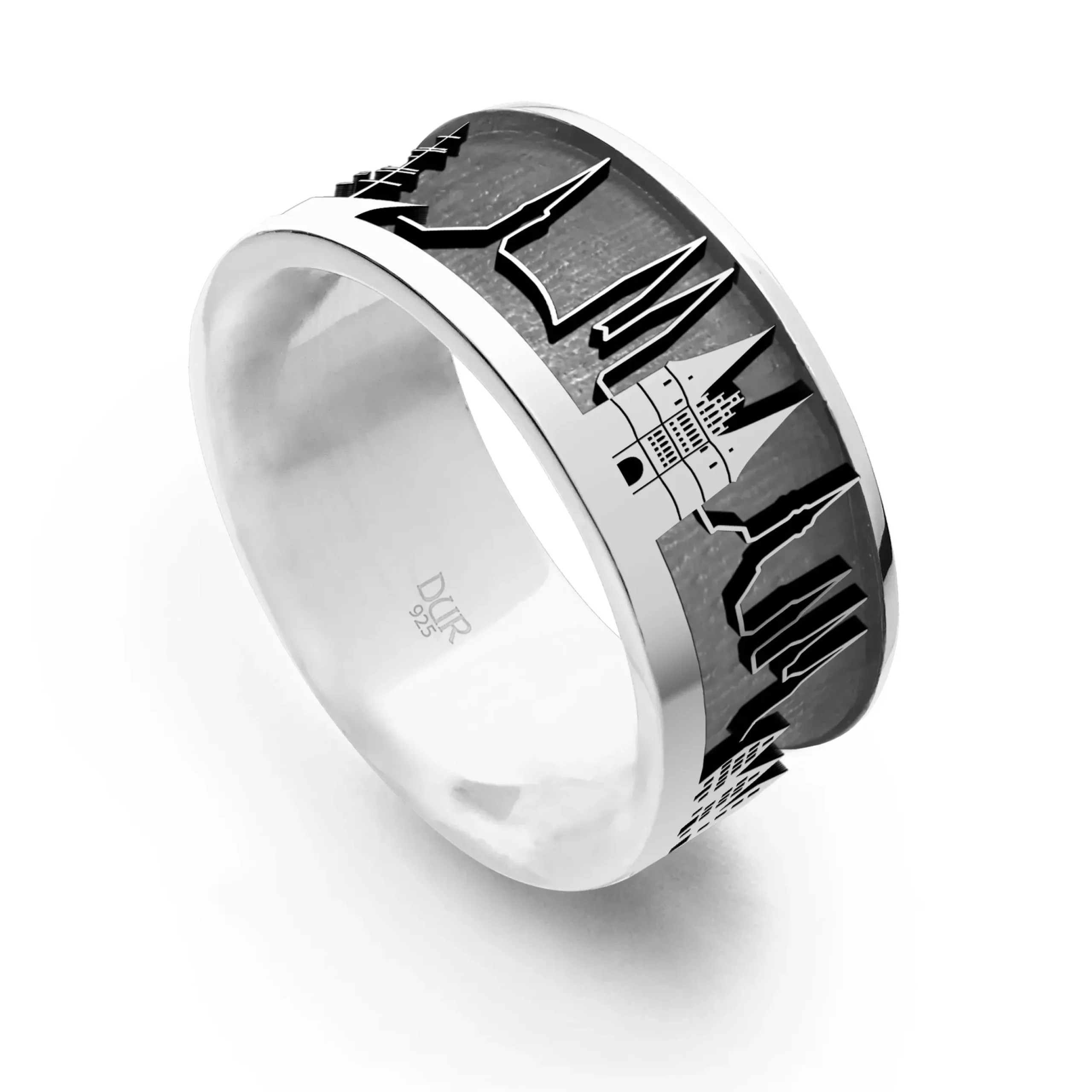 Stadtring „Lübeck“ Premiumausführung mit den silbernen Motiven:die Passat, Holstentor, im Hintergrund die sieben Türme, Salzspeicher, innen dunkel rhodiniert, alles aus rhodiniertem 925er Sterling-Silber.