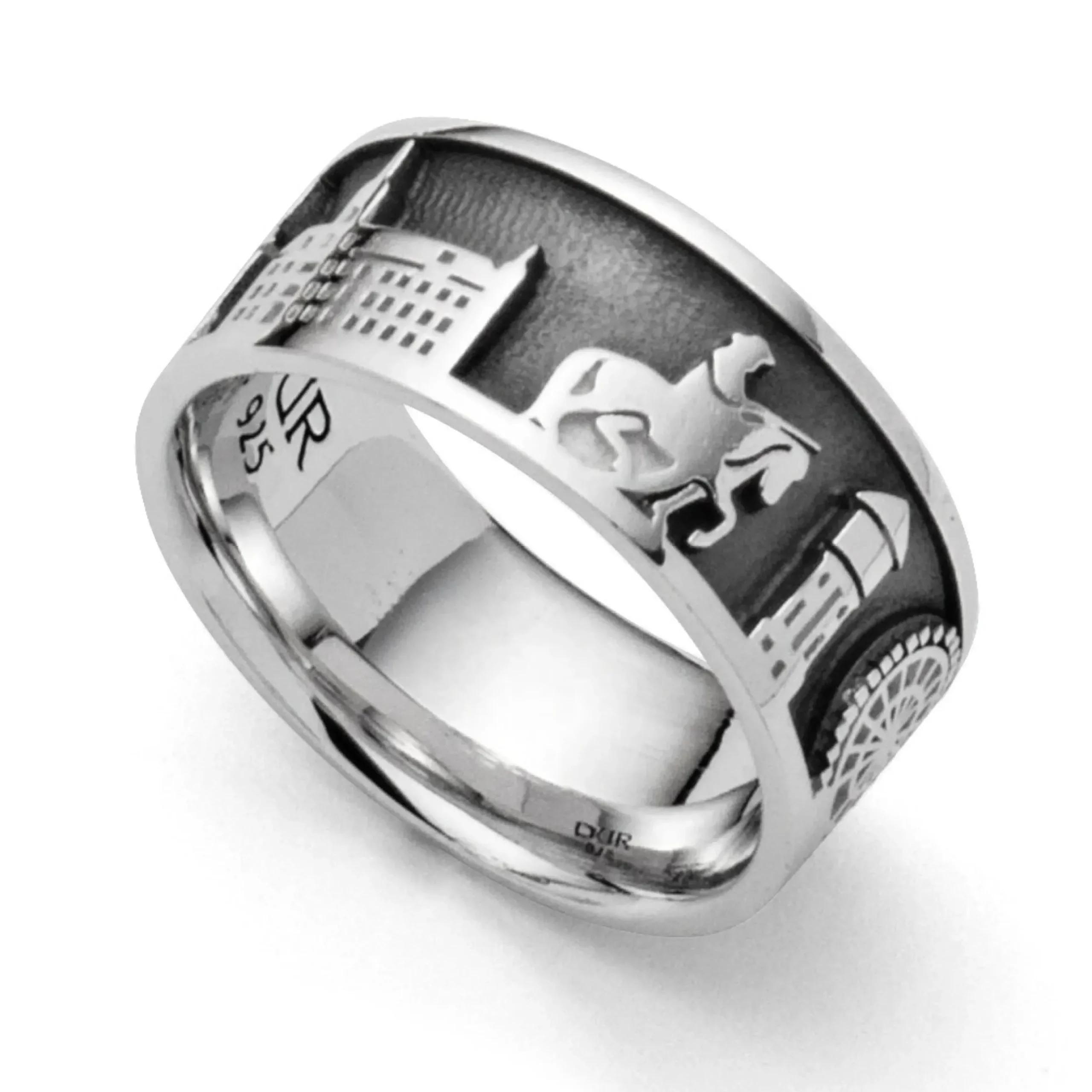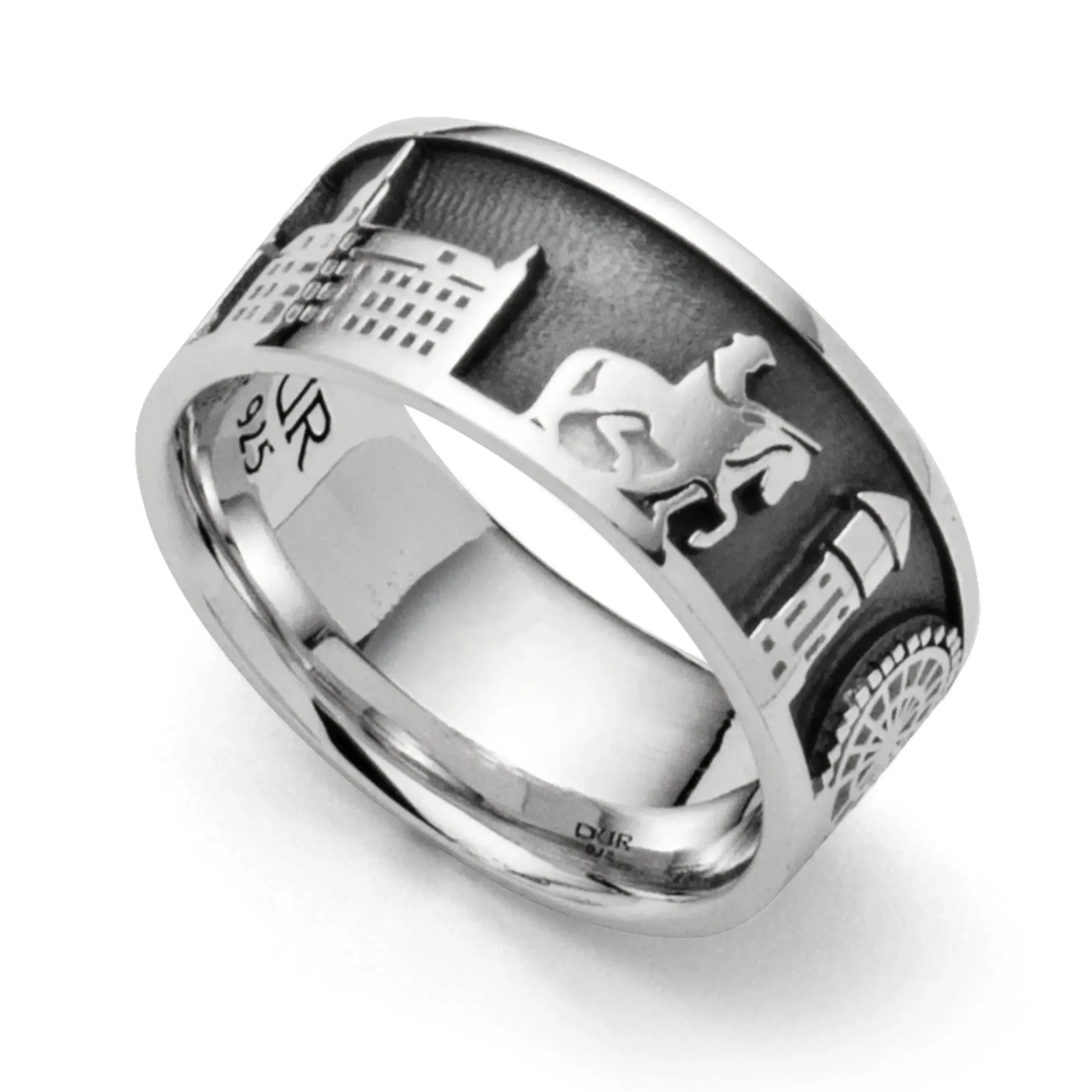 Stadtring „Oldenburg“ Premiumausführung mit dem silbernen Motiven: (Pulverturm – Lappan – Schloß – Graf Anton Günther – Wasserturm – Riesenrad – Rathaus – Buchstaben „OL“), innen dunkel rhodiniert, alles aus rhodiniertem 925er Sterling-Silber.
