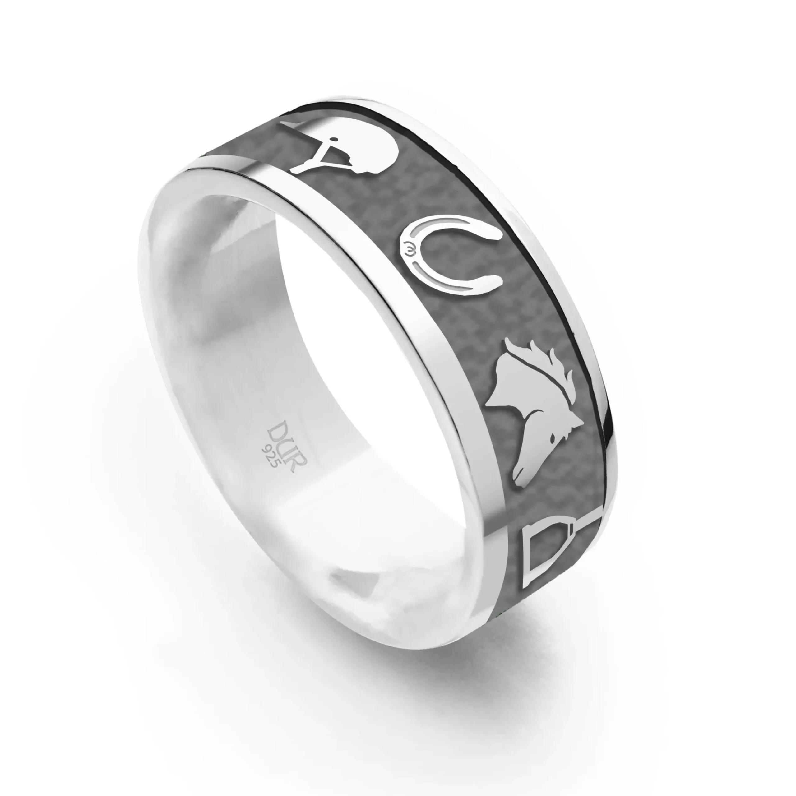 Schmaler Bandring „Pferdeglück“ 7 mm, mit dem Motiven: Sattel – Reithelm – Hufeisen – Pferdekopf – Steigbügel – Reitstiefel – Heuballen, innen dunkel rhodiniert und gefasst in rhodiniertem 925er Sterling-Silber.