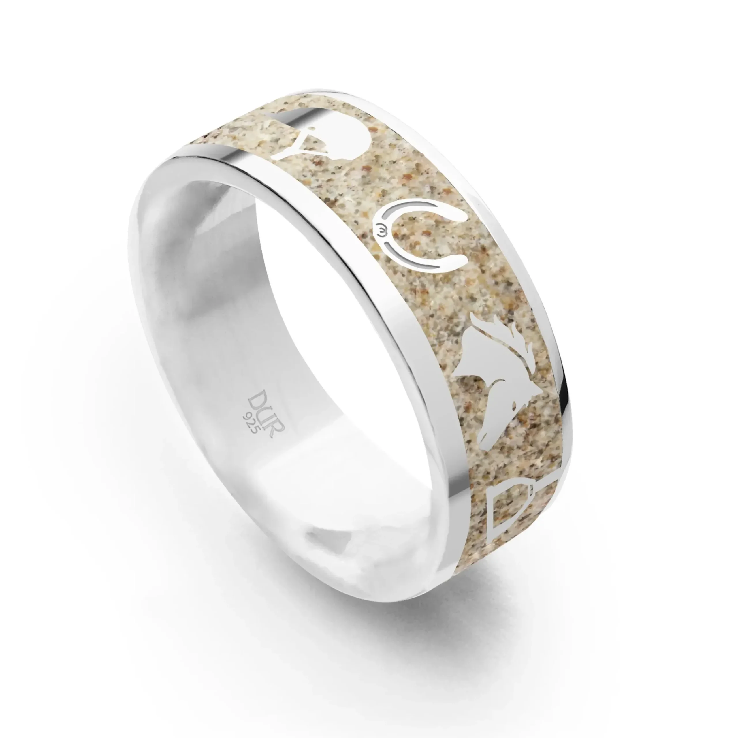 Schmaler Bandring „Pferdeglück“ 7 mm, mit dem Motiven: Sattel – Reithelm – Hufeisen – Pferdekopf – Steigbügel – Reitstiefel – Heuballen, eingebettet in Strandsand und gefasst in rhodiniertem 925er Sterling-Silber.