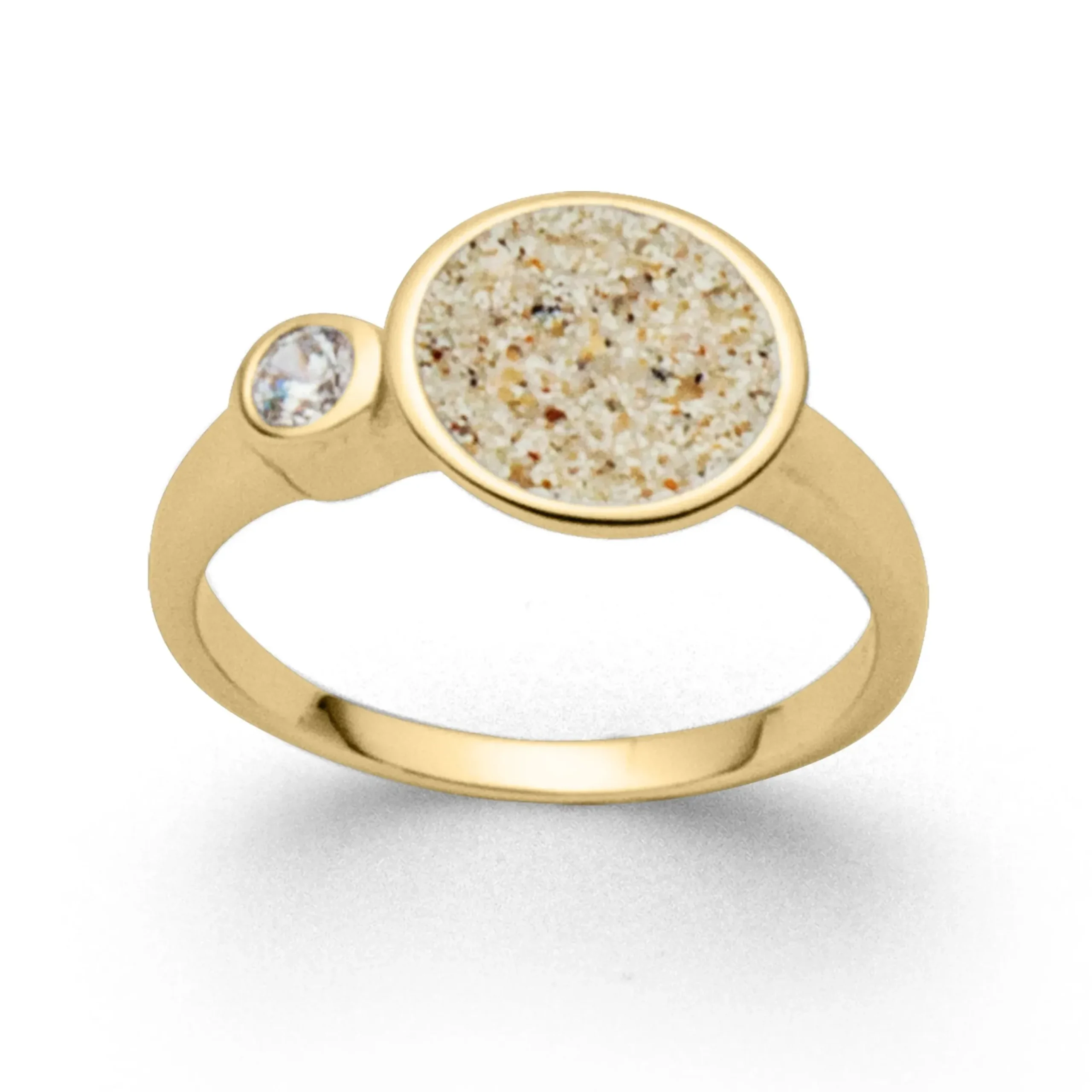 Ring „Polarstern“ mit einer kleinen, mit Strandsand gefüllten Silberschale, der durch die Kombination mit einem seitlich gefassten, 3 mm Zirkoniastein wie ein „Polarstern“ erstrahlt. Gefasst in vergoldetem 925er Sterlingsilber.