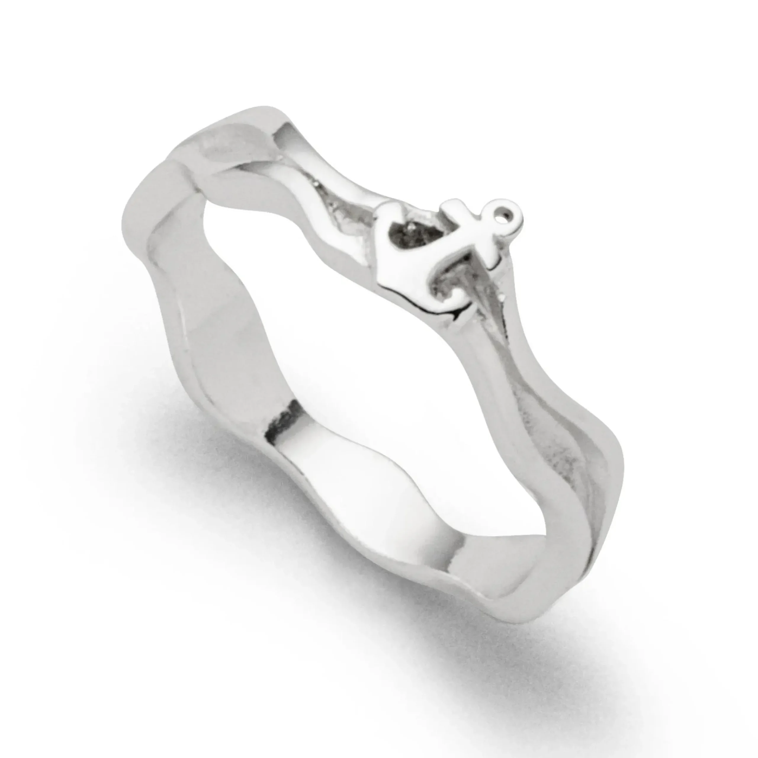 Schmaler, geschwungener Ring „Strandwellen Anker“ mit einem Anker auf einem Wattenmeer-Muster, aus anlaufgeschütztem 925er Sterling-Silber (e-coat)