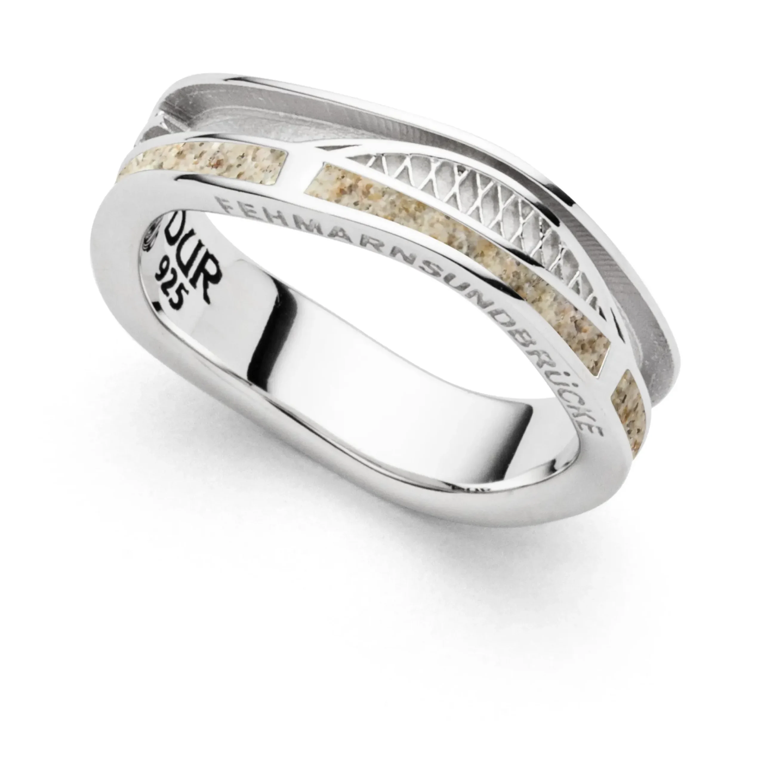 Ring Strandwellen „Fehmarnsundbrücke“ in Bandform, mit zwei Wellen, eine Welle inn matt mit den 3 Motiven: – Möwe – Fehmarnsundbrücke – Möwe-, die zweite Welle ausgefüllt mit Strandsand und dem eingravierten Wort „Fehmarnsundbrücke“ im Rand, alles aus rhodiniertem 925er Sterling-Silber. Durch die Rhodinierung ist das Schmuckstück anlaufgeschützt.