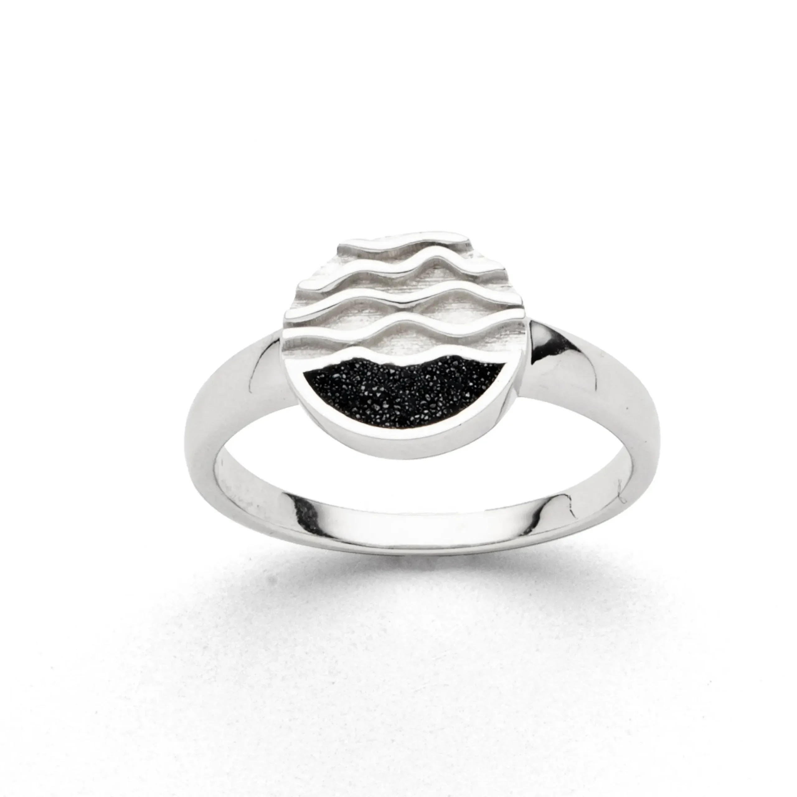 Ring „Strandwellen“, im unteren Drittel mit Lavasand gefüllt, gefasst in rhodiniertem 925er Sterlingsilber.