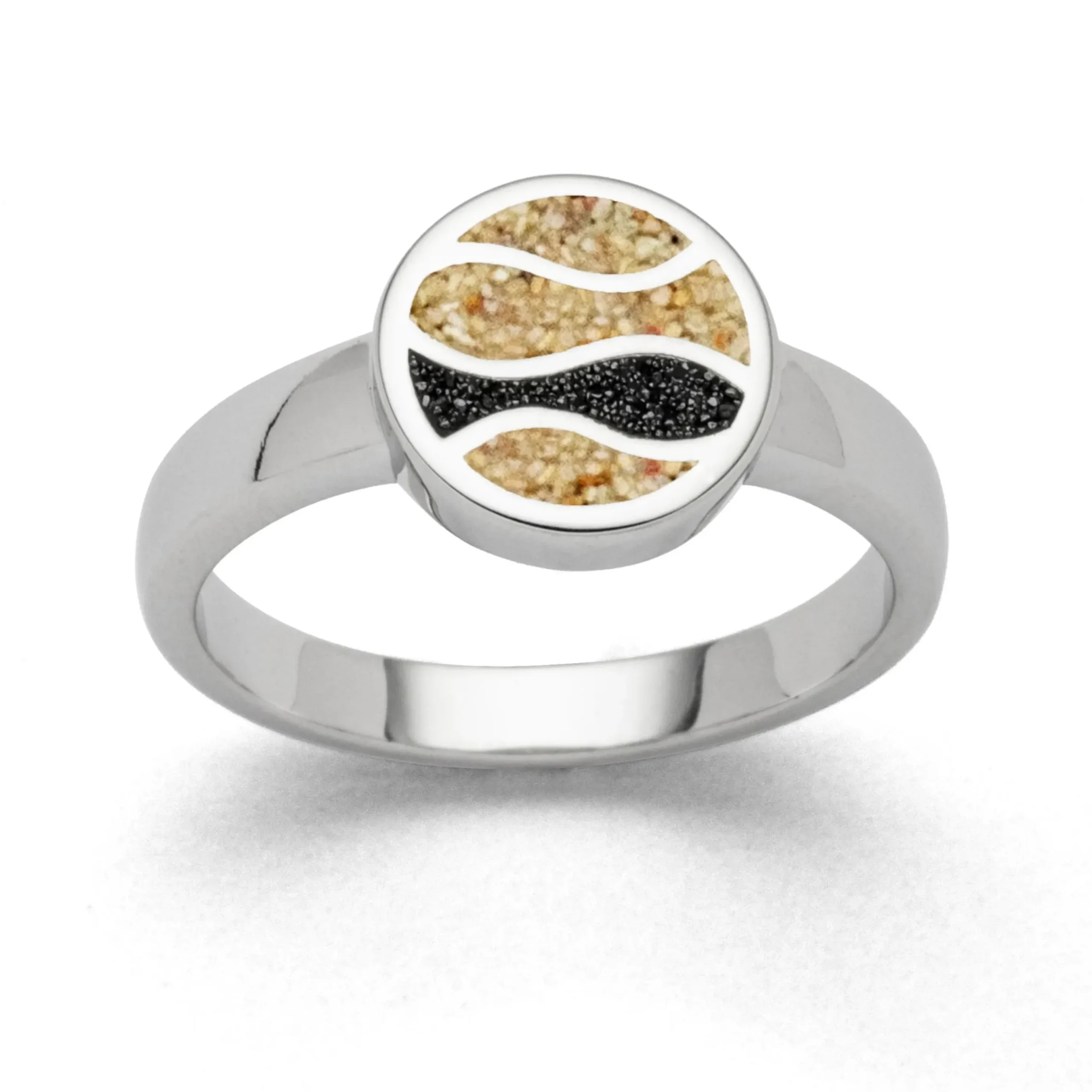Ring „Strandwellen“, mit Wellenmuster, gefüllt mit Strandsand und schwarzem Lavasand, gefaßt in rhodiniertem 925er Sterlingsilber. Durch die Rhodinierung ist das Schmuckstück anlaufgeschützt.