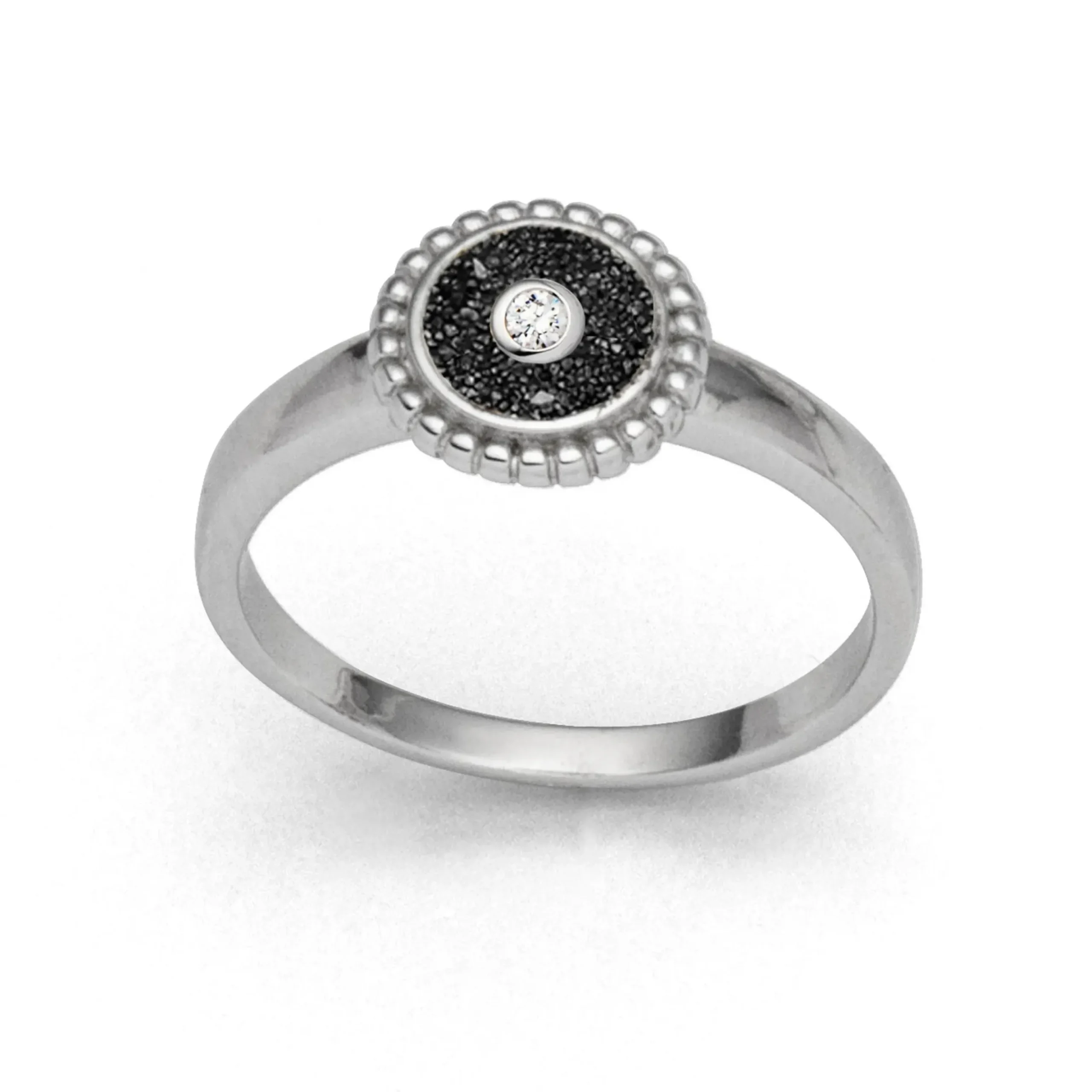 Zierlicher „Strandzauber 2.0“-Ring , gefüllt mit Lavasand und einem Zirkonia in der Mitte, umrahmt von kleinen Silberkügelchen, angefertigt aus rhodiniertem 925er Sterlingsilber. Durch die Rhodinierung ist das Schmuckstück anlaufgeschützt.