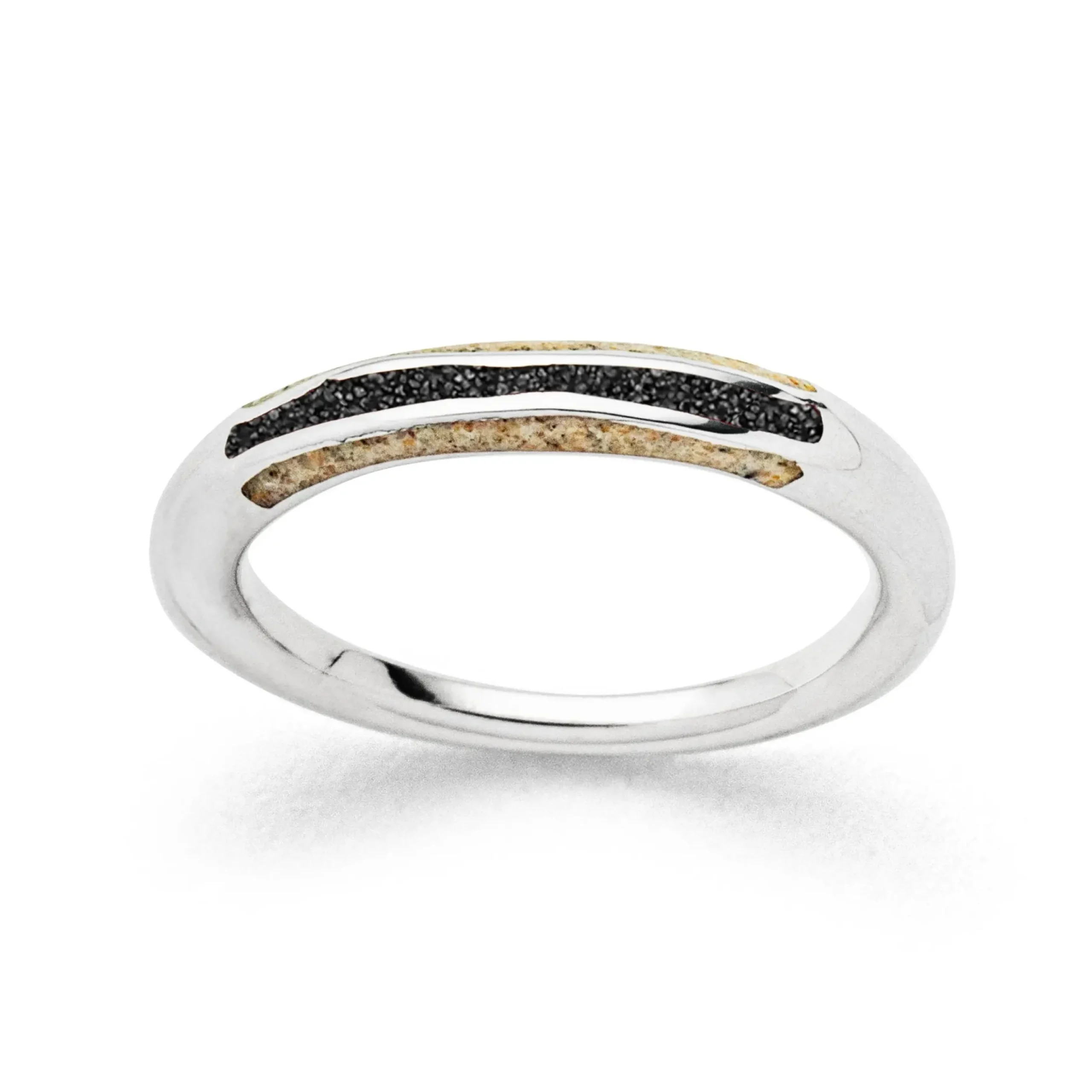 Handgefertigter Ring „Wellenspiel“ mit drei Wellen, gefüllt mit Strandsand und Lavasand, etwas schmal verlaufende untere Ringschiene, alles aus rhodiniertem 925er Sterlingsilber. Durch das Rhodium ist das Schmuckstück anlaufgeschützt.