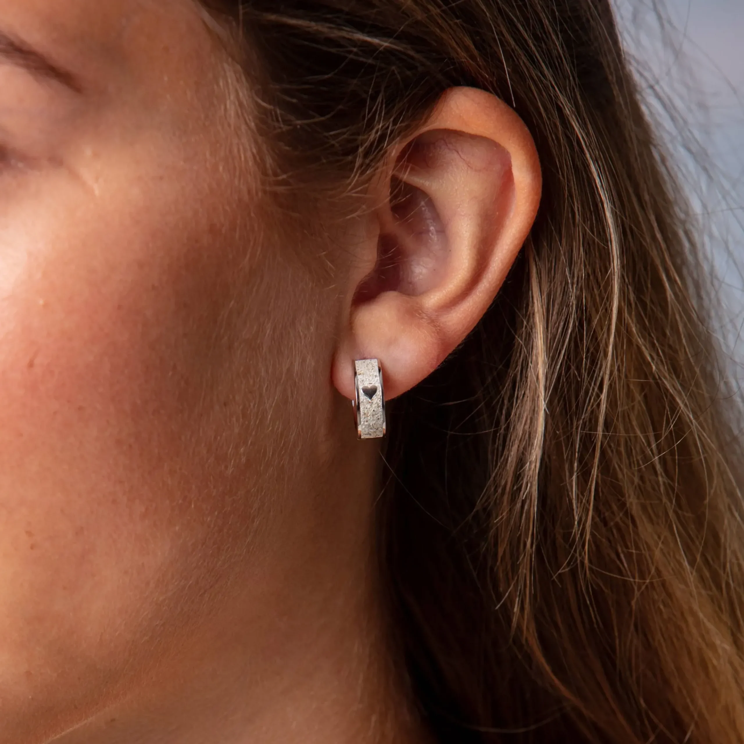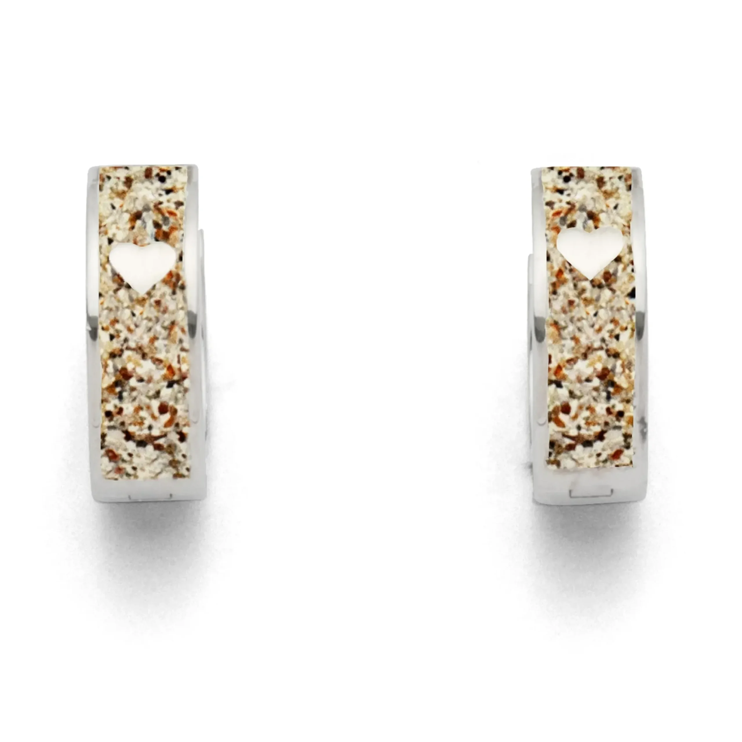 Klappcreole „Herz“ mit einem kleinen in Strandsand gebetteten Herz, gefaßt in rhodiniertem 925er Sterlingsilber.