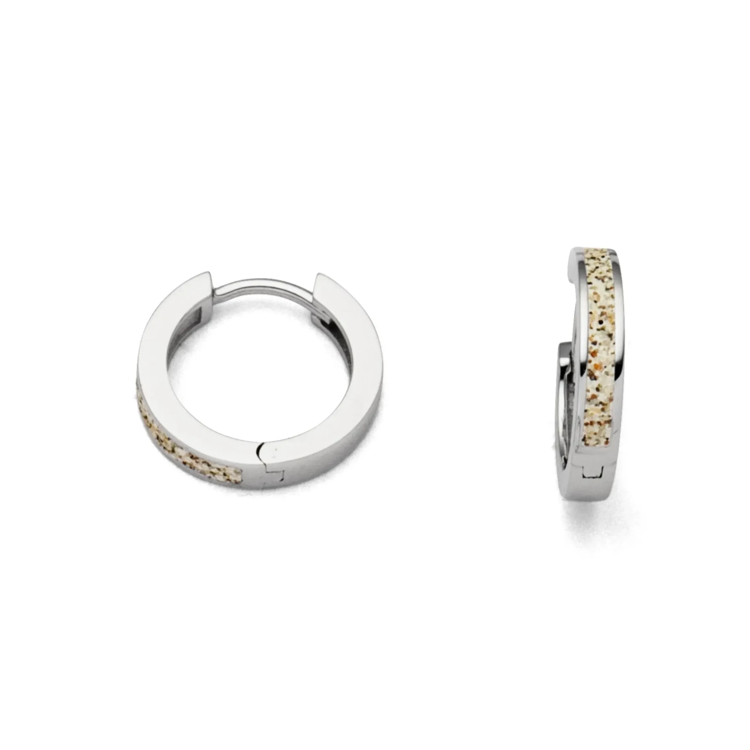 Schmale, zierliche Klappcreole „Marina“, mit Strandsand gefüllt und gefaßt in rhodiniertem und poliertem 925er Sterlingsilber. Ein maritimes Schmuckstück und durch die Rhodinierung anlaufgeschützt.