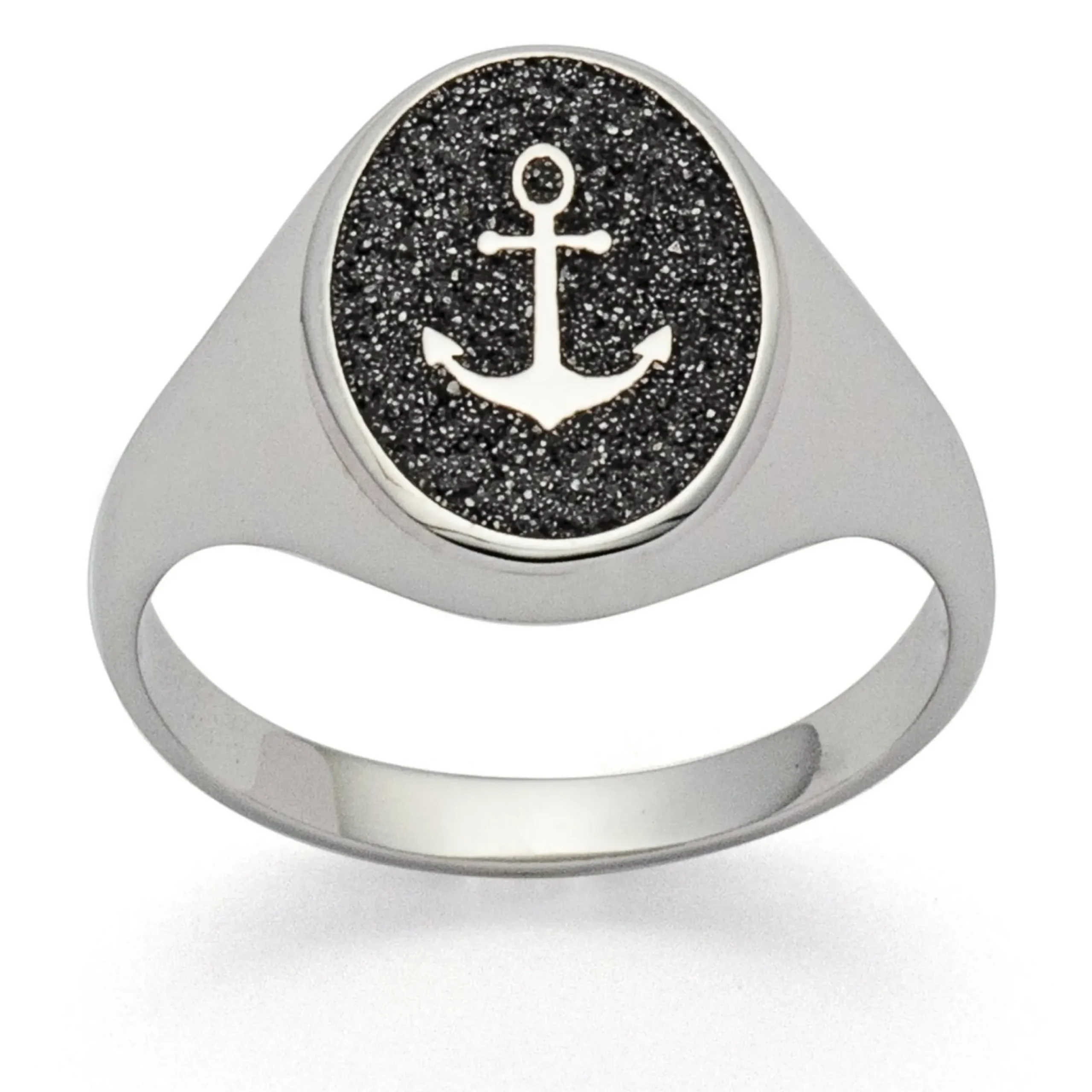 Siegelring „Anker“, ovaler Siegelring mit einem Anker als Motiv, eingebettet in Lavasand, aus rhodiniertem 925er Sterlingsilber.