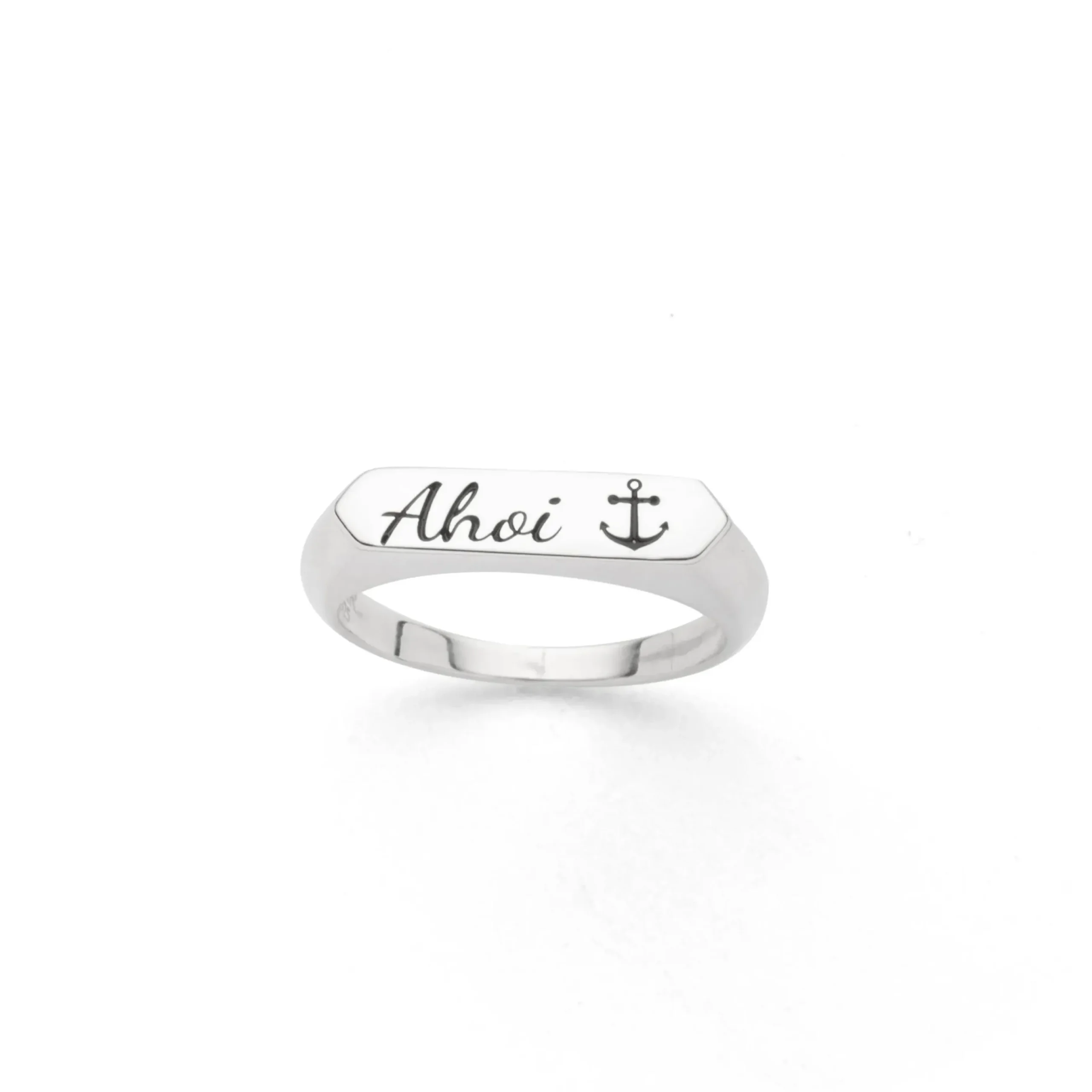 Signet Ring „Ahoi/Anker“ mit oxidiertem „Ahoi“ Schriftzug und einem Anker, aus 925er Sterlingsilber.