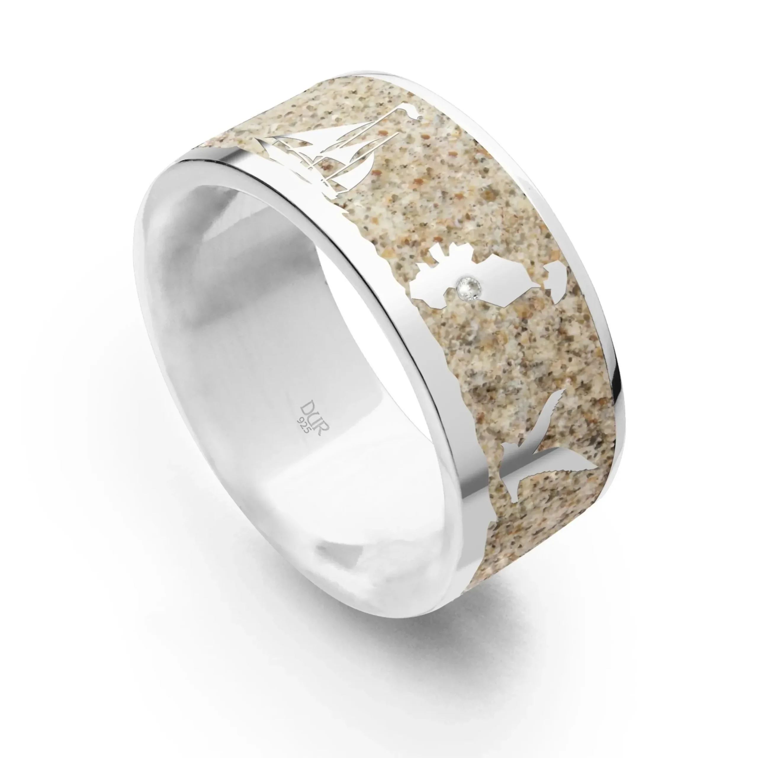 Strandsandring „Grömitz“ mit den Motiven: – Sonne – Segelschiff – Silhouette Ostholstein mit einem Zirkonia an der Position von Grömitz – Möwe – Fußabdrücke, eingebettet in Strandsand und gefasst in rhodiniertem 925er Sterling-Silber.