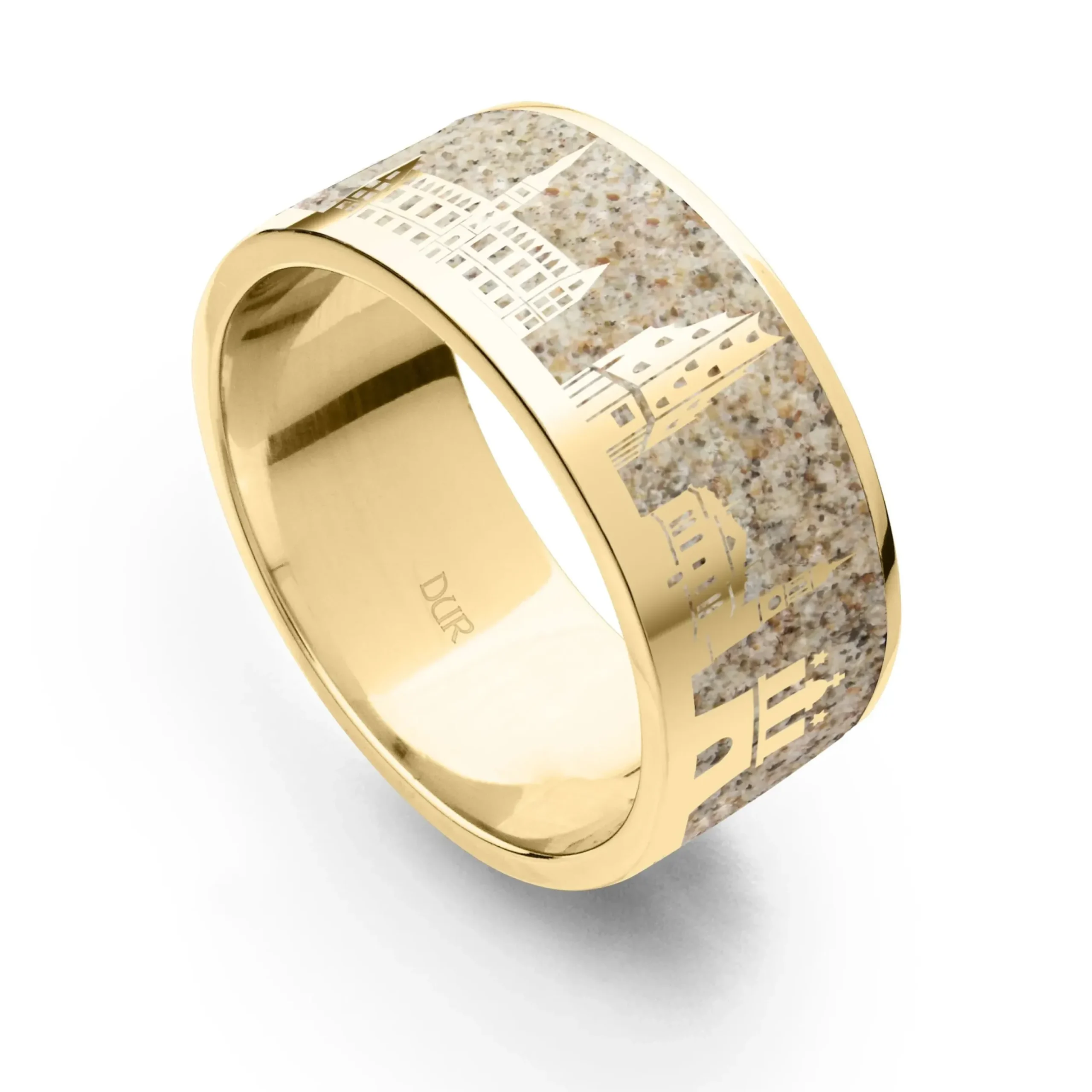 Strandsandring „Hamburg“ mit den Motiven Segler, Möwe, Hafenkräne, Rathaus, Elbphilharmonie, Michel, Hammaburg, Schiff, eingebettet in Strandsand und gefasst in vergoldetem 925er Sterling-Silber.