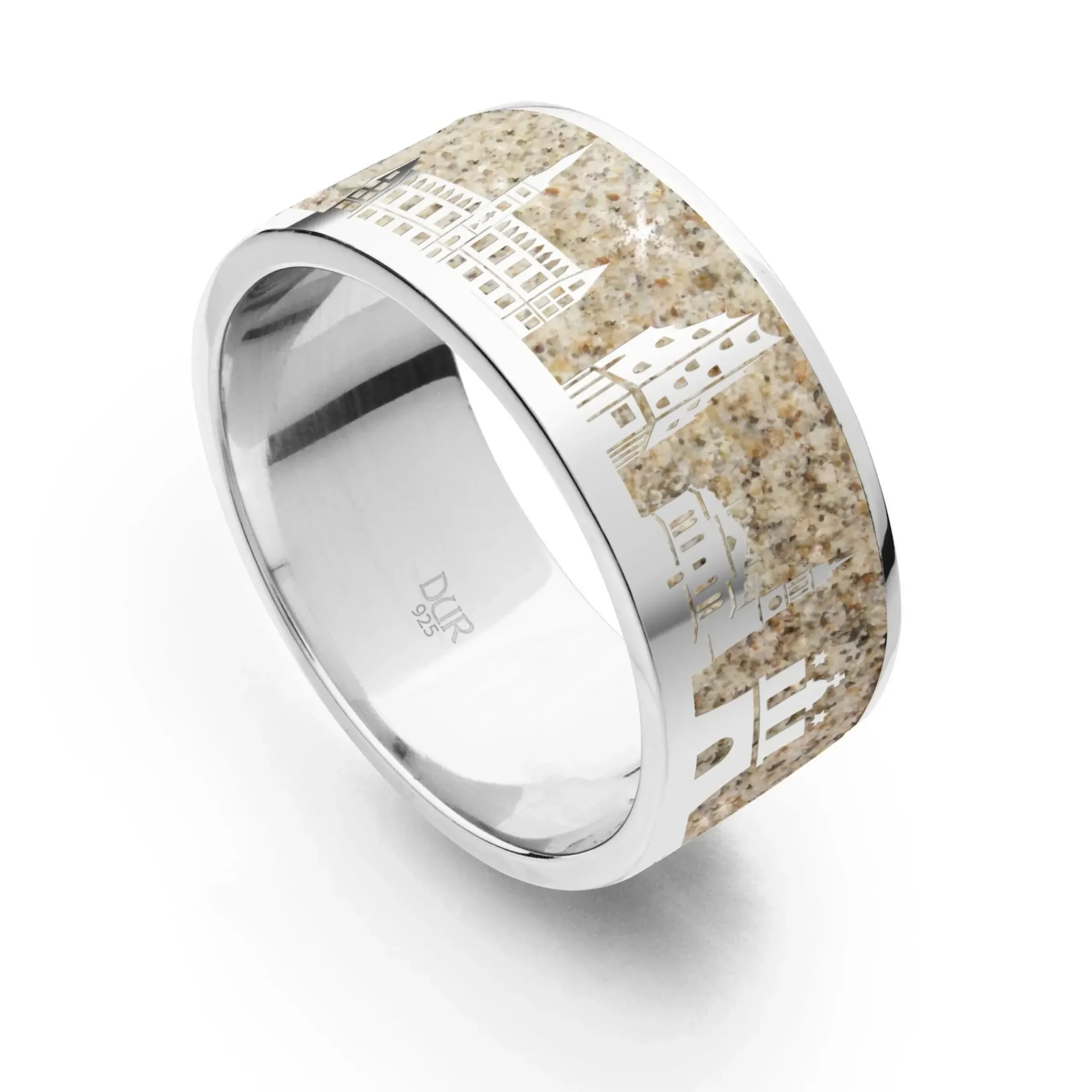 Alster, Elbphilharmonie, Speicherstadt und St. Pauli – die sympathische Hansestadt Hamburg hat viele Facetten. Als Erinnerung an einen schönen Aufenthalt, einen besonderen Lebensabschnitt, oder für alle die Ihre Verbundenheit zu Hamburg stilvoll zum Ausdruck bringen möchten, ist dieser elegante und zeitlose Strandring ein unverzichtbarer Begleiter.Der glanzvolle Stadtring verspricht höchsten Tragekomfort durch hochwertige Materialien und überzeugt durch sein klares Design, sowie eine hohe Symbolik, die ihn für jeden Tragenden einzigartig macht.Auf dem außergewöhnlichen Band des natürlichen Strandsands sind formschön verschiedene Motive eingearbeitet (Segler, Möwe, Hafenkrähe, Rathaus, Elbphilharmonie, Michel, Hammaburg, Schiff), welche die Vielfältigkeit der schönen Hafenmetropole auf zauberhafte Weise einfangen.Der geschmackvolle Kontrast zwischen poliertem, rhodiniertem Silber, sowie den feinen Sandkörnern zieht alle Blicke auf sich und erinnert an Urlaub am Meer.Funkeln sie mit diesem entzückenden Schmuckstück um die Wette und zeigen Sie, dass Hamburg eine Herzenssache ist.