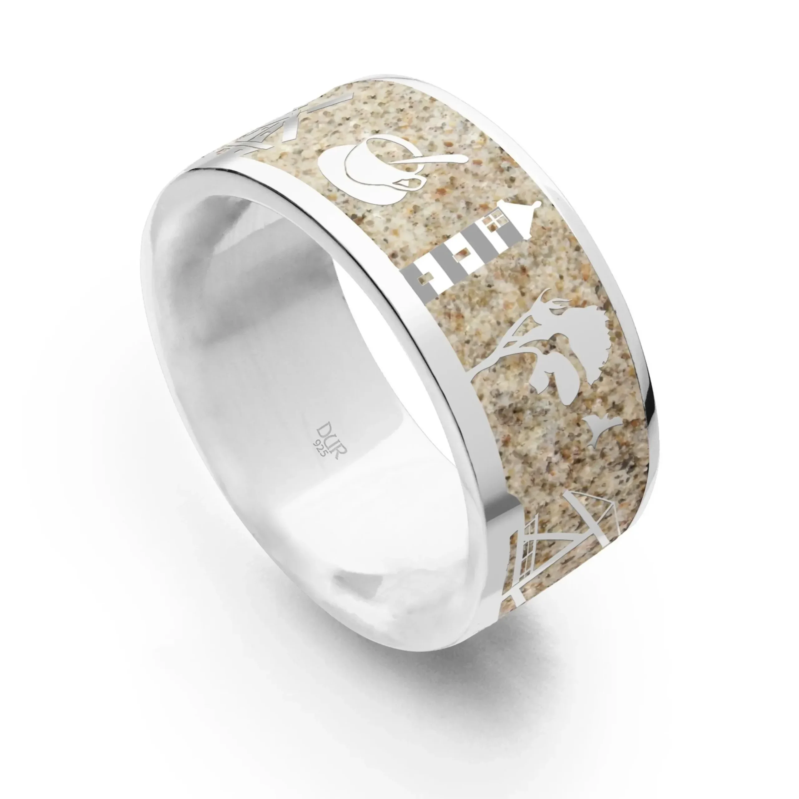 Wattenmeer, Nordsee und Tee – Ostfriesland fasziniert mit abwechslungsreicher Landschaft, sowie einmaligen Natur und Kulturschätzen. Als Erinnerung an schöne Urlaubsmomente, einen besonderen Lebensabschnitt, oder für alle die Ihre Verbundenheit zu Ostfriesland stilvoll zum Ausdruck bringen möchten, ist dieser elegante und zeitlose Strandring ein unverzichtbarer Begleiter.Der glanzvolle Stadtring verspricht höchsten Tragekomfort durch hochwertige Materialien und überzeugt durch sein klares Design, sowie eine hohe Symbolik, die ihn für jeden Tragenden einzigartig macht.Auf dem außergewöhnlichen Band des natürlichen Strandsands sind formschön verschiedene Motive eingearbeitet (Kuh (Wittmund), Windmühle (Aurich), Teetasse (Leer), Leuchtturm (Pilsum), Windflüchter (Norden), Möwe (Nordsee), Fehnbrücke (Wiesmoor)), welche die Vielfältigkeit der schönen Region auf zauberhafte Weise einfangen.Der geschmackvolle Kontrast zwischen poliertem, rhodiniertem Silber, sowie den feinen Sandkörnern zieht alle Blicke auf sich und erinnert an Urlaub am Meer.Funkeln sie mit diesem entzückenden Schmuckstück um die Wette und zeigen Sie, dass Ostfriesland eine Herzenssache ist.