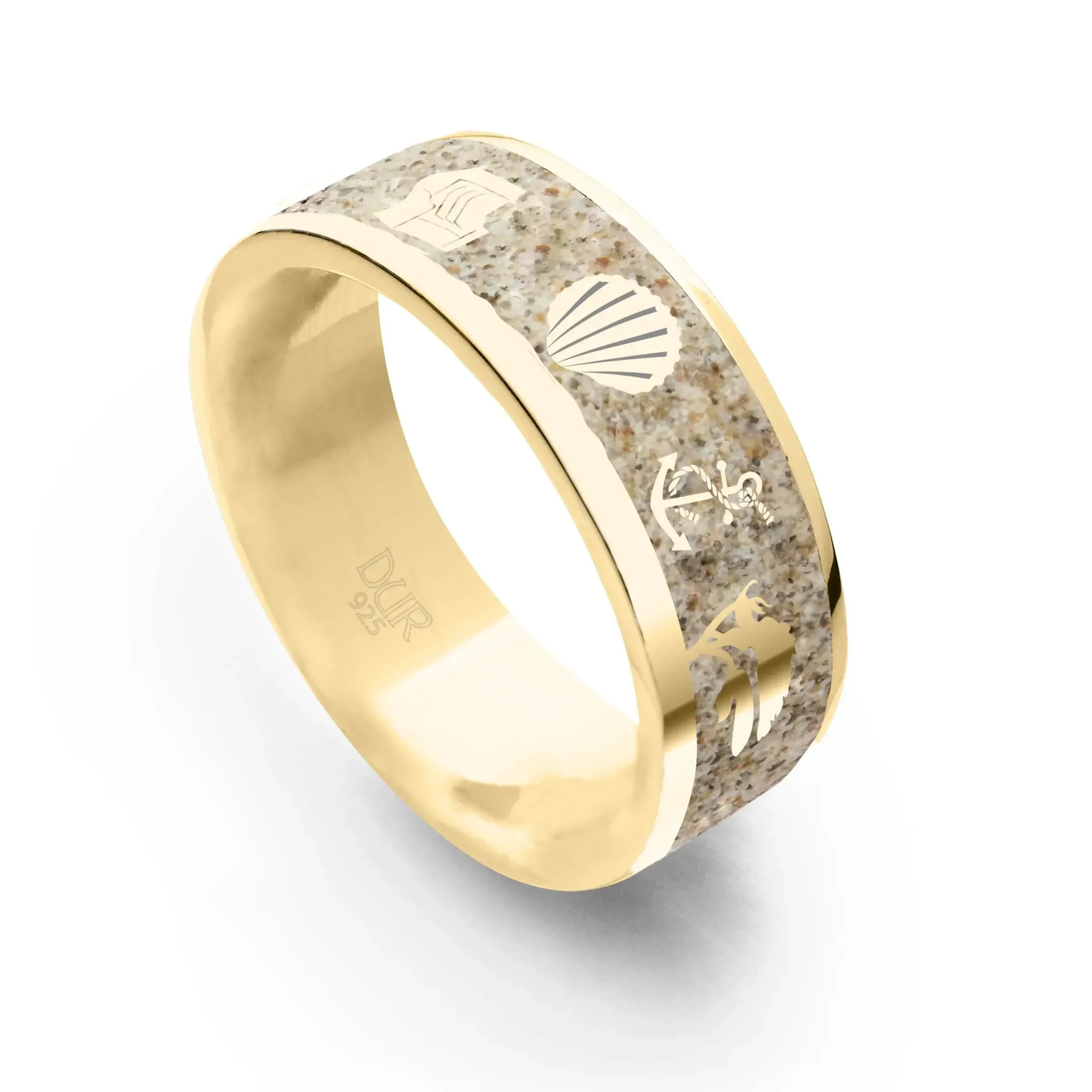 Strandring „Ostsee“ 7 mm, mit den Motiven: Möwe – Leuchtturm – Strandkorb – Muschel – Anker – Windflüchter – Segelboot, eingebettet in Strandsand und gefasst in vergoldetem 925er Sterling-Silber.