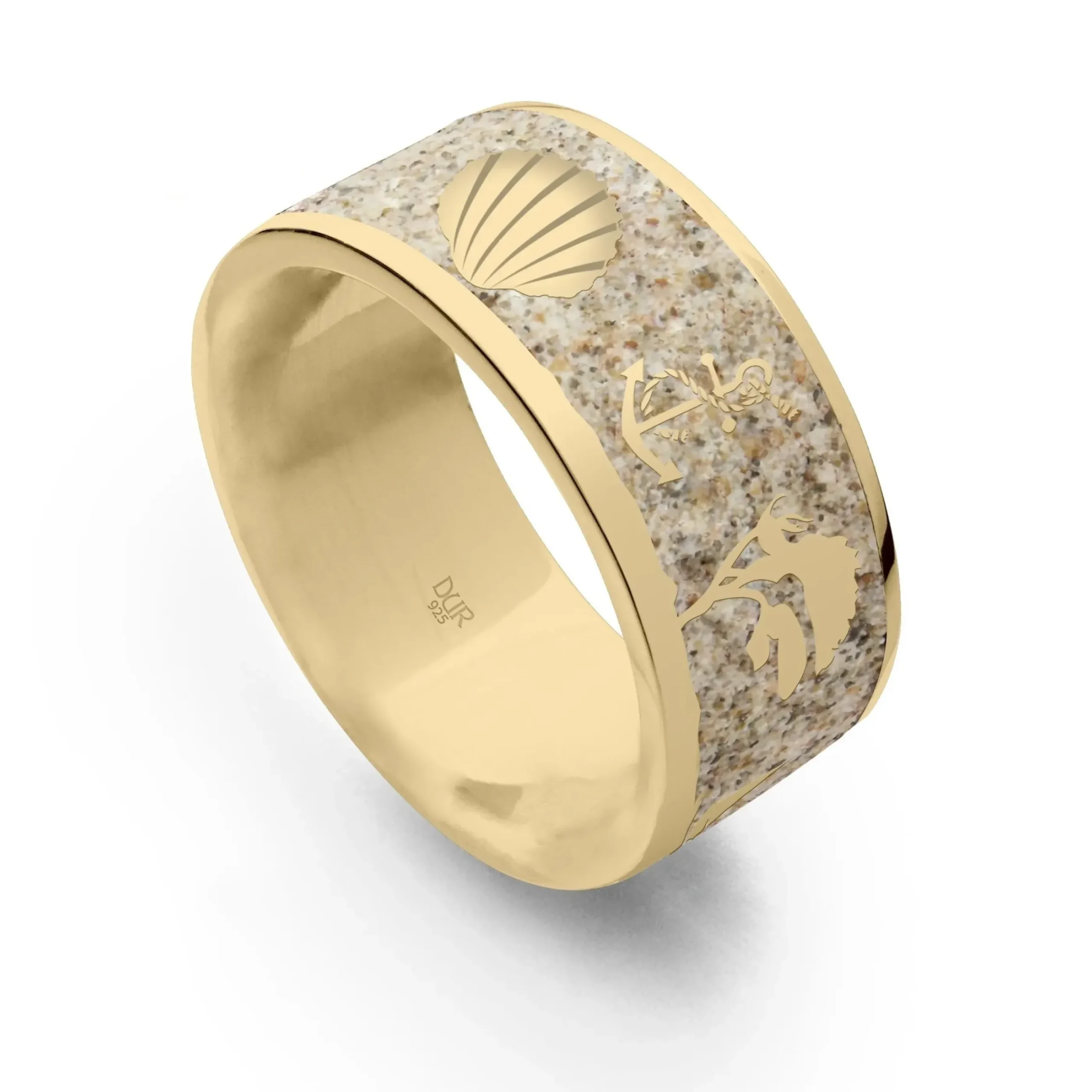 Strandsandring „Ostsee“ mit den Motiven: Möwe – Leuchtturm – Strandkorb – Muschel – Anker – Windflüchter – Segelboot, eingebettet in Strandsand und gefasst in vergoldetem 925er Sterling-Silber.