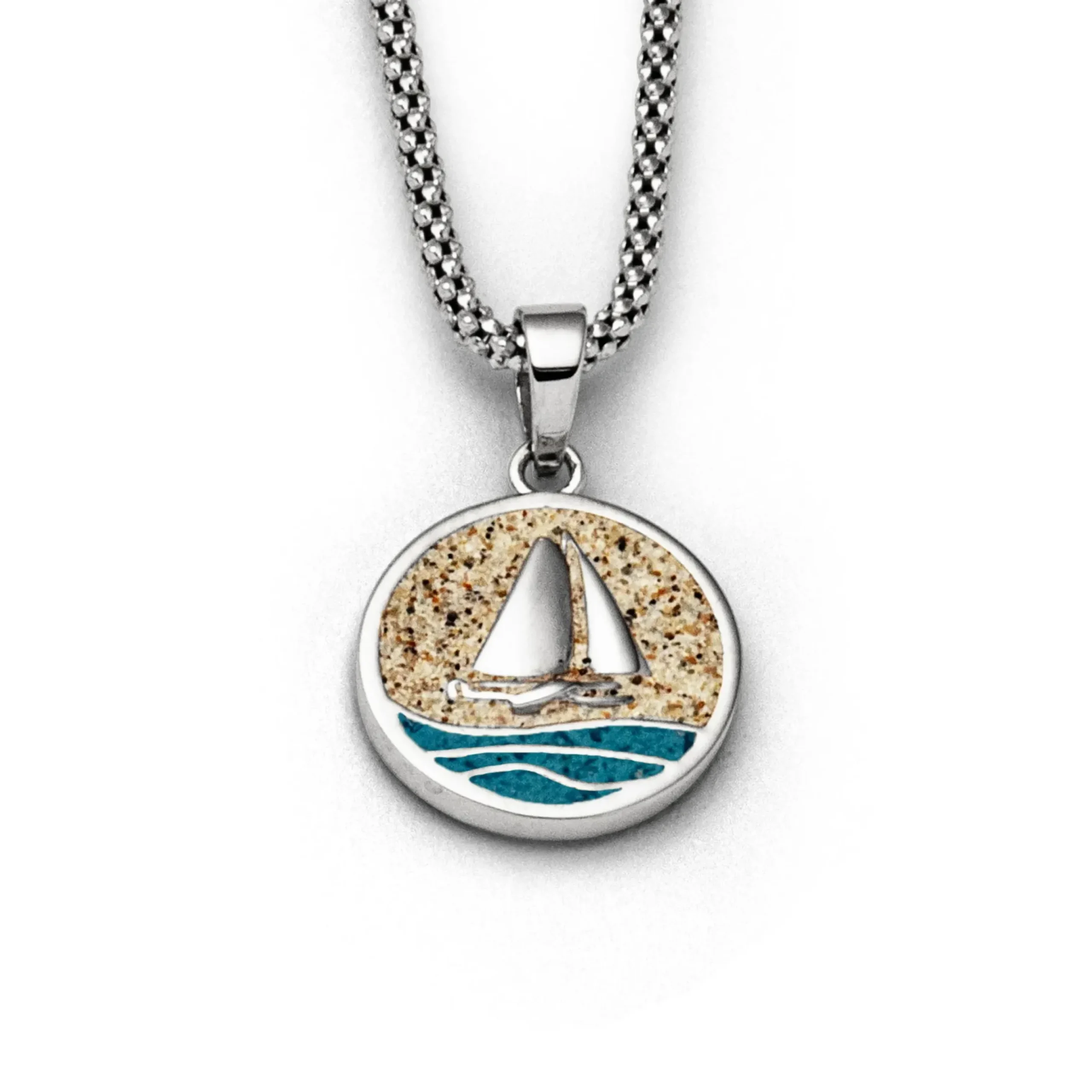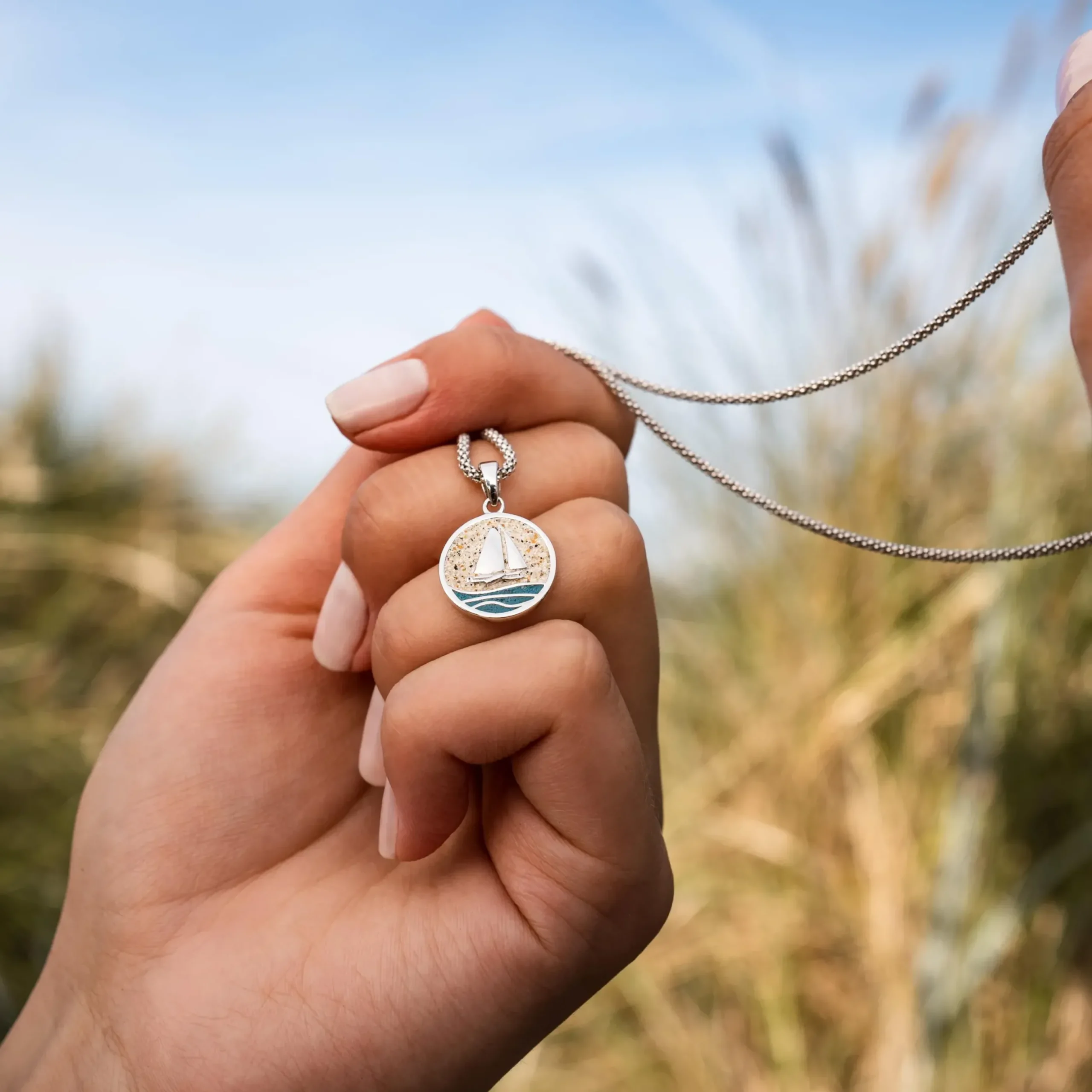 Anhänger „Ahoi“, kleiner runder Anhänger mit einem Plattbodenschiff und Wellen, in Strandsand und blauem Steinsand eingebettet und gefaßt in rhodiniertem 925er Silber