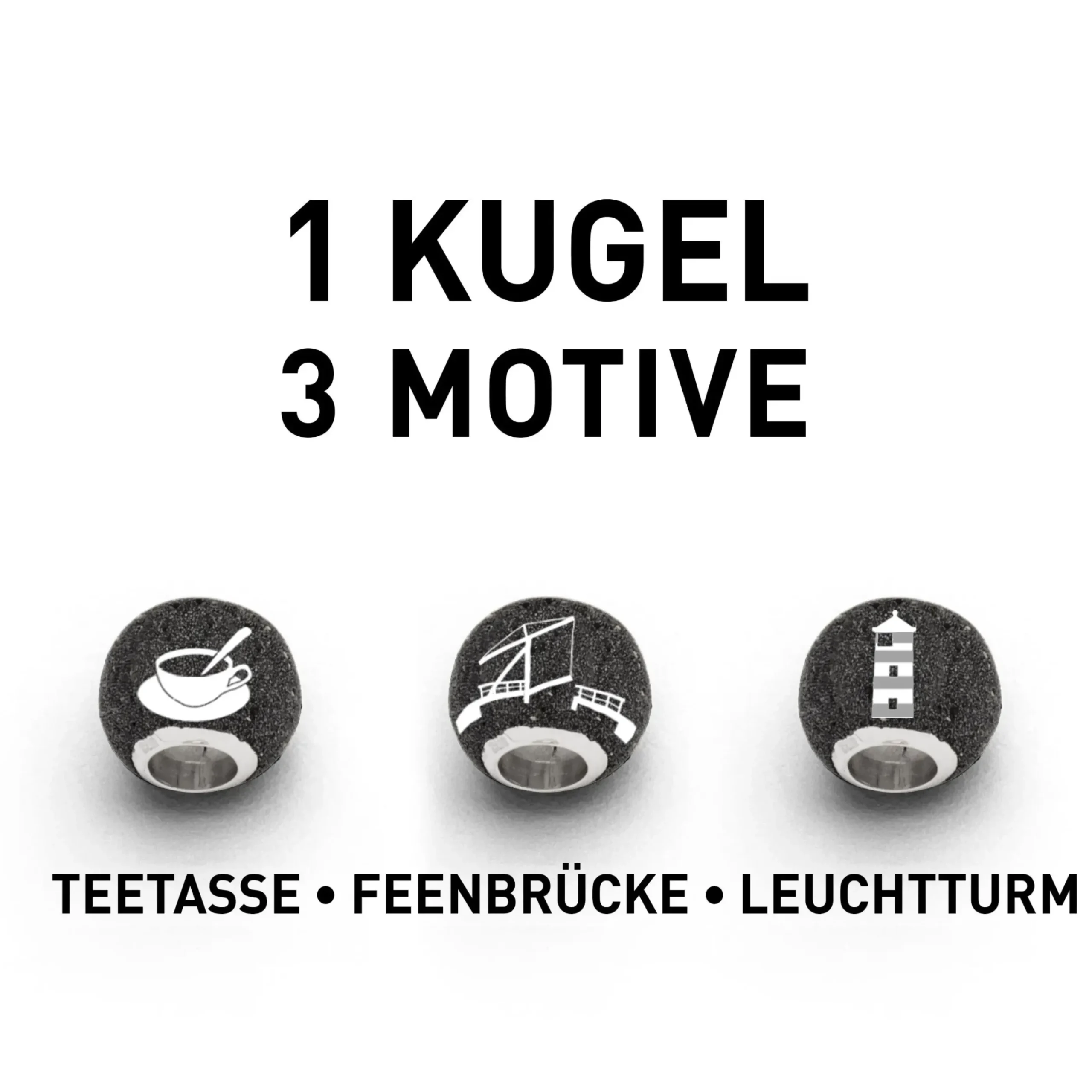 Wattenmeer, Nordsee und Tee – Ostfriesland fasziniert mit abwechslungsreicher Landschaft, sowie einmaligen Natur und Kulturschätzen. Als Erinnerung an schöne Urlaubsmomente, oder für alle, die Verbundenheit zur Heimat zum Ausdruck bringen möchten, ist dieser schöne Anhänger unverzichtbar.Die Lavasandkugel verzaubert mit klarem, glänzenden Design und den drei silbernen, symbolträchtigen Motiven „Teetasse (Leer), Leuchtturm (Pilsum) und Fehnbrücke (Wiesmoor)“.Durch die edle Materialkombination aus glitzerndem Lavasand und hochwertigem 925er Sterlingsilber ist der Anhänger ein echter Blickfang, der jedes Outfit aufwertet. Einzigartige, glanzvolle und aussagekräftige Anhänger, die jedem Schmuckstück eine individuelle Note verleihen – das sind Beads. Die modernen Anhänger zeichnen sich durch ihre außergewöhnliche Kombination von feinsten Naturmaterialien mit hochwertigem, rhodinierten 925er Sterling Silber aus und erstrahlen in verschiedenen Designs mit unterschiedlichen Motiven.Die hohe symbolische Aussagekraft der verschiedenen Motive unterstreicht Ihre Persönlichkeit und macht den Anhänger zu einem idealen Begleiter für Ihren Alltag.Mit einem Innendurchmesser von 5 mm sind die Beads mit zahlreichen Halsketten oder gängigen Sammelarmbändern kombinierbar. Somit können Sie selbst Ihr individuelles Schmuckstück gestalten.