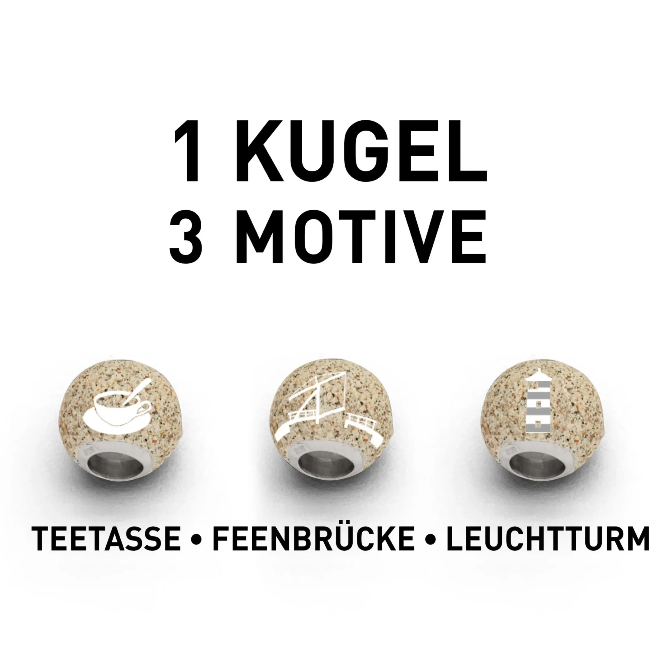 Wattenmeer, Nordsee und Tee – Ostfriesland fasziniert mit abwechslungsreicher Landschaft, sowie einmaligen Natur und Kulturschätzen. Als Erinnerung an schöne Urlaubsmomente, oder für alle, die Verbundenheit zur Heimat zum Ausdruck bringen möchten, ist dieser schöne Anhänger unverzichtbar.Die Strandsandkugel verzaubert mit klarem, glänzenden Design und den drei silbernen, symbolträchtigen Motiven „Teetasse (Leer), Leuchtturm (Pilsum) und Fehnbrücke (Wiesmoor)“.Durch die edle Materialkombination aus feinem Strandsand und hochwertigem 925er Sterlingsilber ist der Anhänger ein echter Blickfang, der jedes Outfit aufwertet. Einzigartige, glanzvolle und aussagekräftige Anhänger, die jedem Schmuckstück eine individuelle Note verleihen – das sind Beads. Die modernen Anhänger zeichnen sich durch ihre außergewöhnliche Kombination von feinsten Naturmaterialien mit hochwertigem, rhodinierten 925er Sterling Silber aus und erstrahlen in verschiedenen Designs mit unterschiedlichen Motiven.Die hohe symbolische Aussagekraft der verschiedenen Motive unterstreicht Ihre Persönlichkeit und macht den Anhänger zu einem idealen Begleiter für Ihren Alltag.Mit einem Innendurchmesser von 5 mm sind die Beads mit zahlreichen Halsketten oder gängigen Sammelarmbändern kombinierbar. Somit können Sie selbst Ihr individuelles Schmuckstück gestalten.