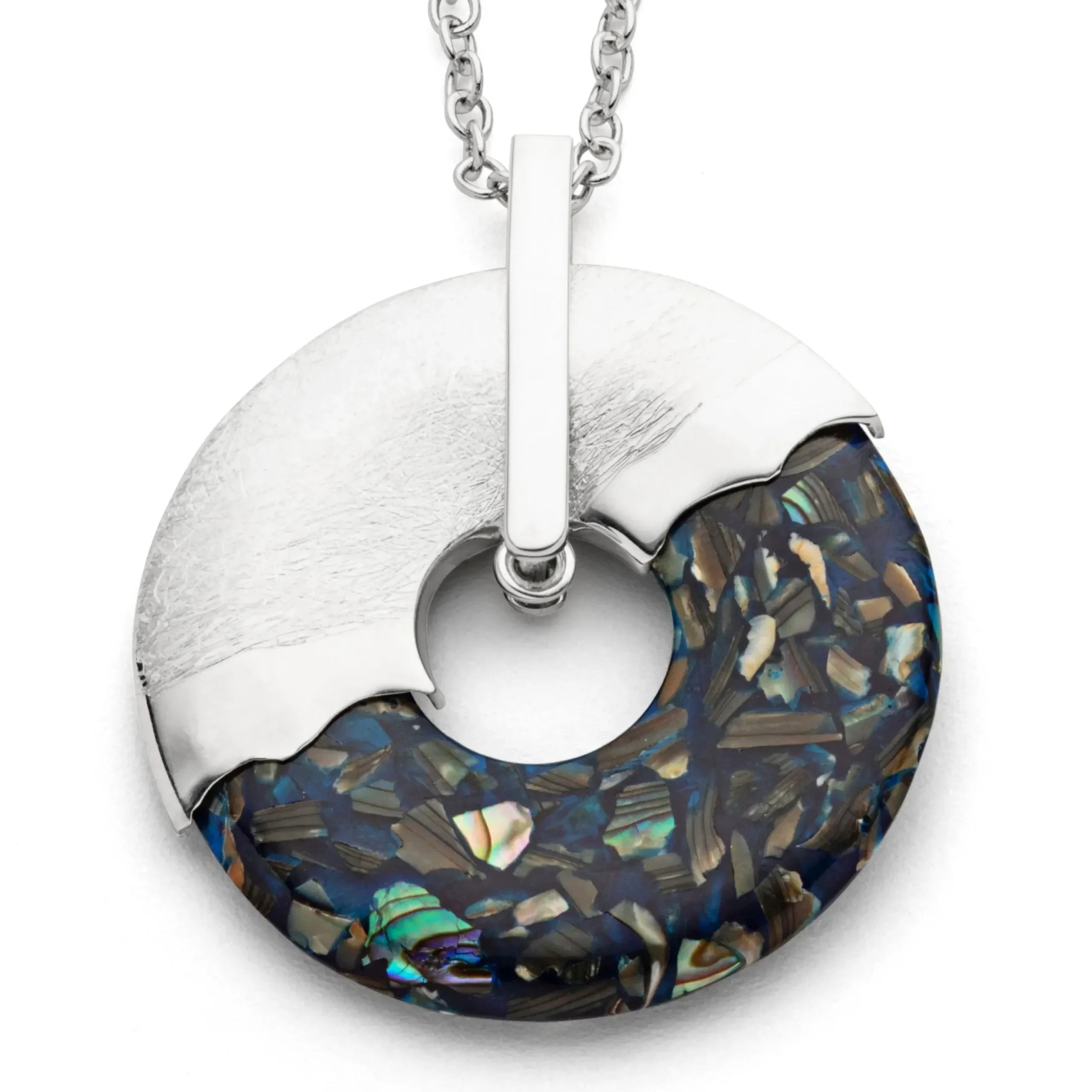 Handgefertigter Anhänger in Donutform mit einer Hälfte aus Mosaik-Seeopal und einer Hälfte aus gebürstetem 925er Sterling-Silber