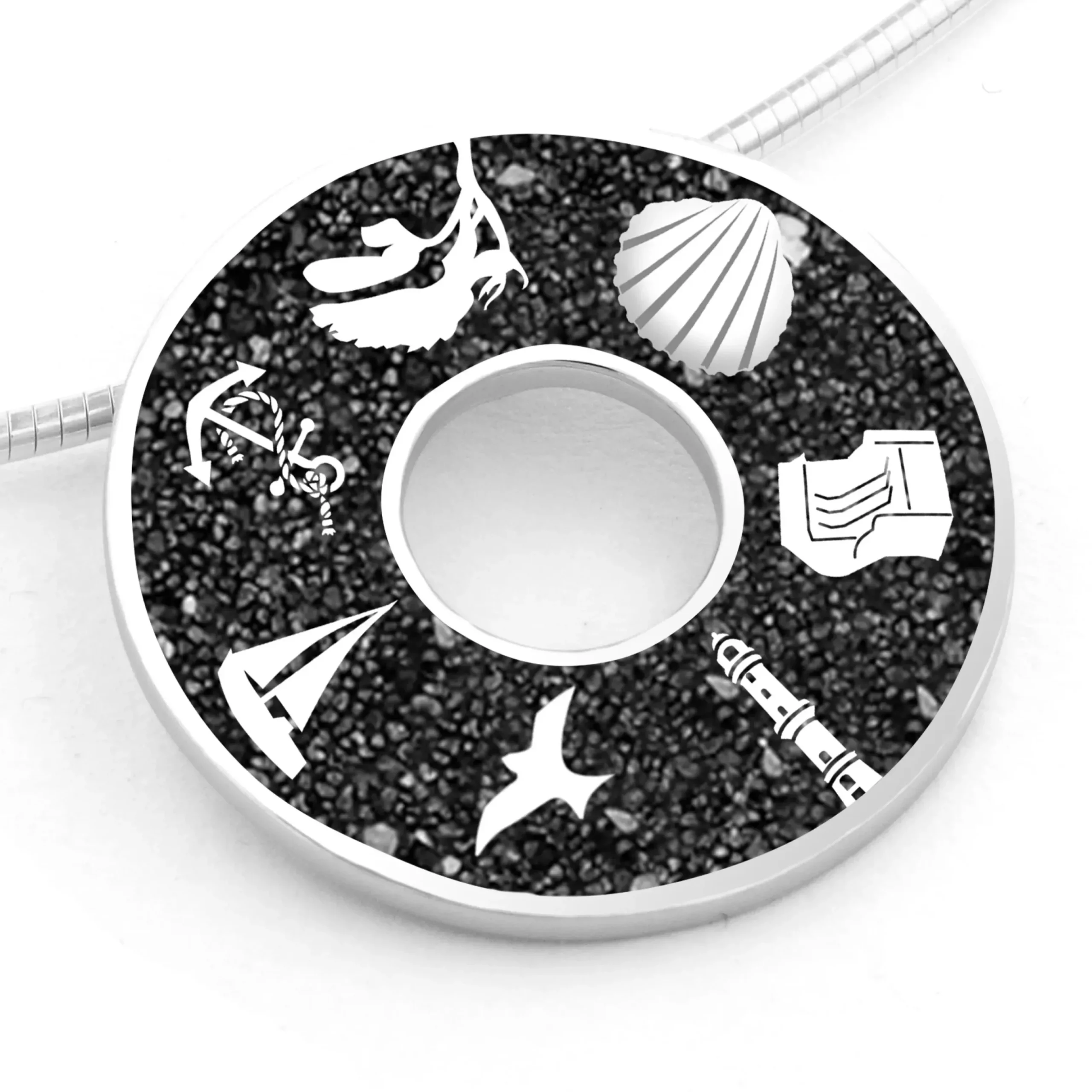 Runder Anhänger „Ostsee“ mit den Motiven: Anker – Windflüchter – Muschel – Strandkorb – Leuchtturm – Möwe – Segelboot, mit Kettenöse auf der Rückseite, eingebettet in Lavasand, gefasst in poliertem und rhodiniertem 925er Sterling-Silber