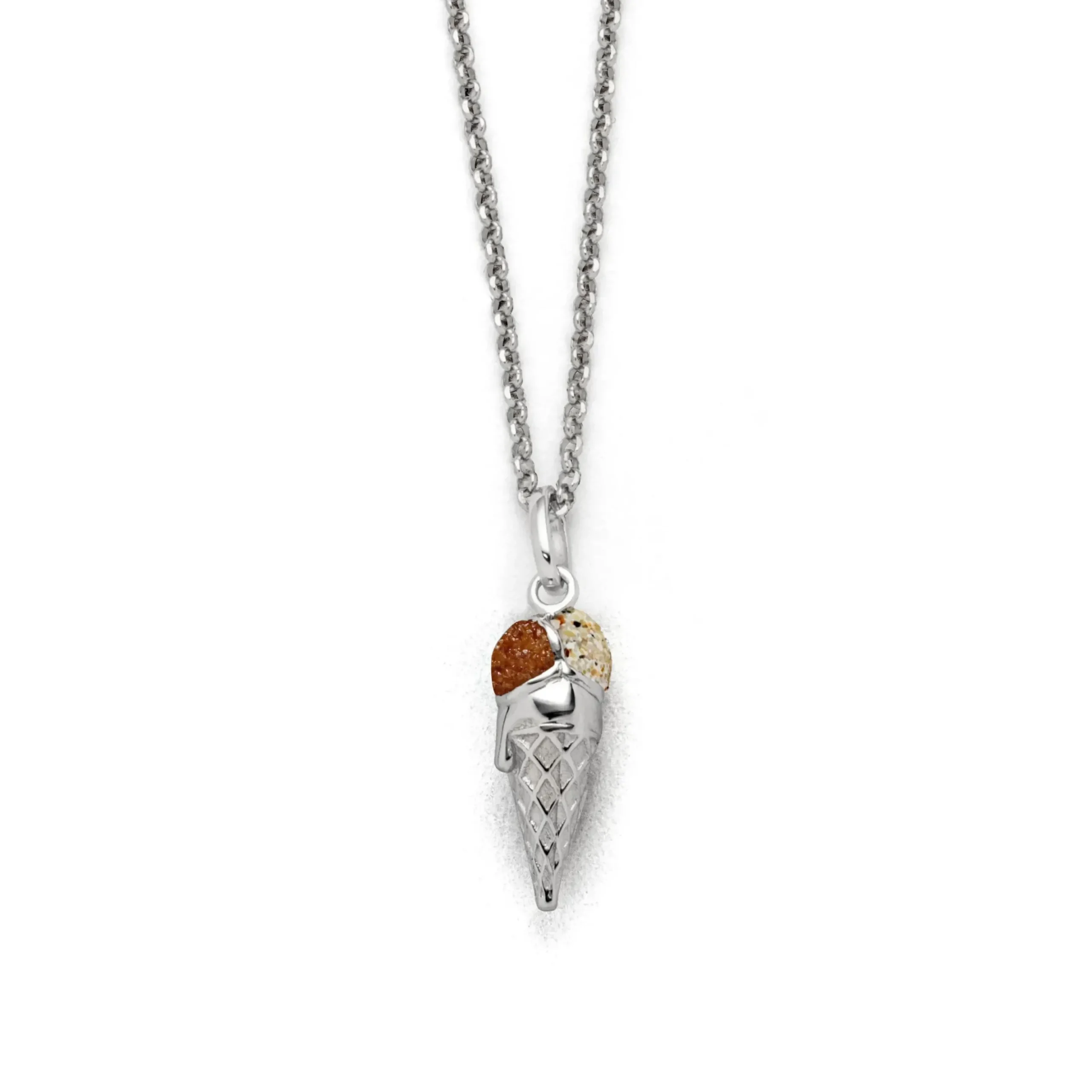 Echte Sehnsucht: Anhänger in Form einer Eistüte, teilweise gefüllt mit Strandsand und Bernsteinsand, alles aus poliertem und rhodiniertem 925er Sterling-Silber
