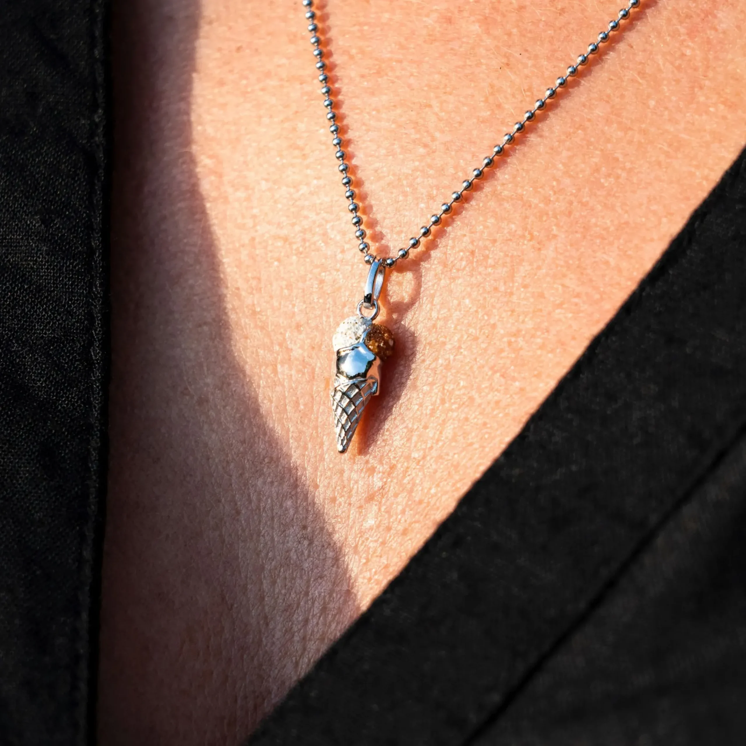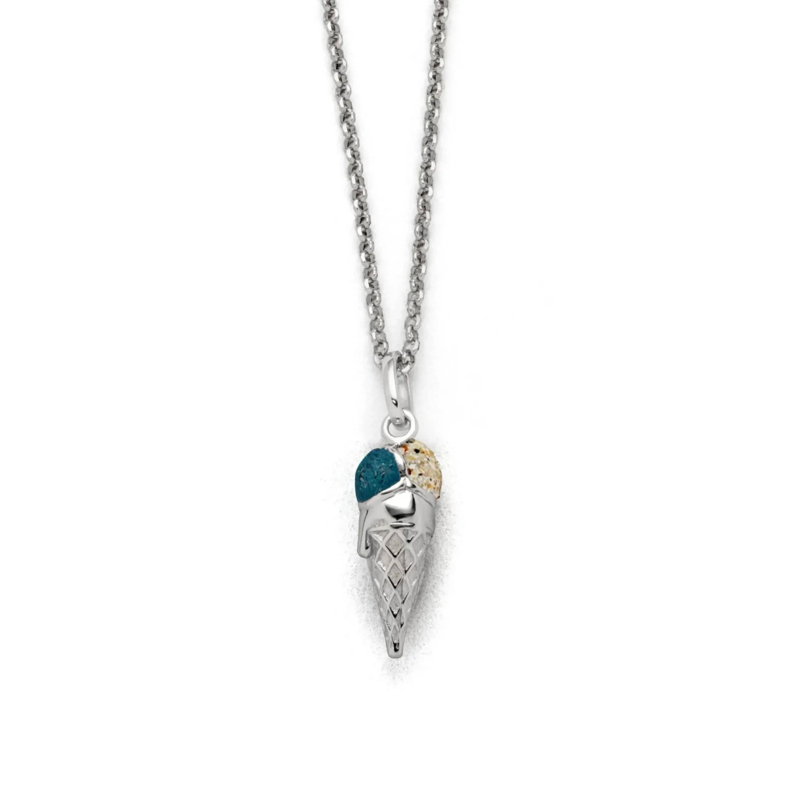Echte Sehnsucht: Anhänger in Form einer Eistüte, teilweise gefüllt mit Strandsand und blauem Steinsand, alles aus poliertem und rhodiniertem 925er Sterling-Silber