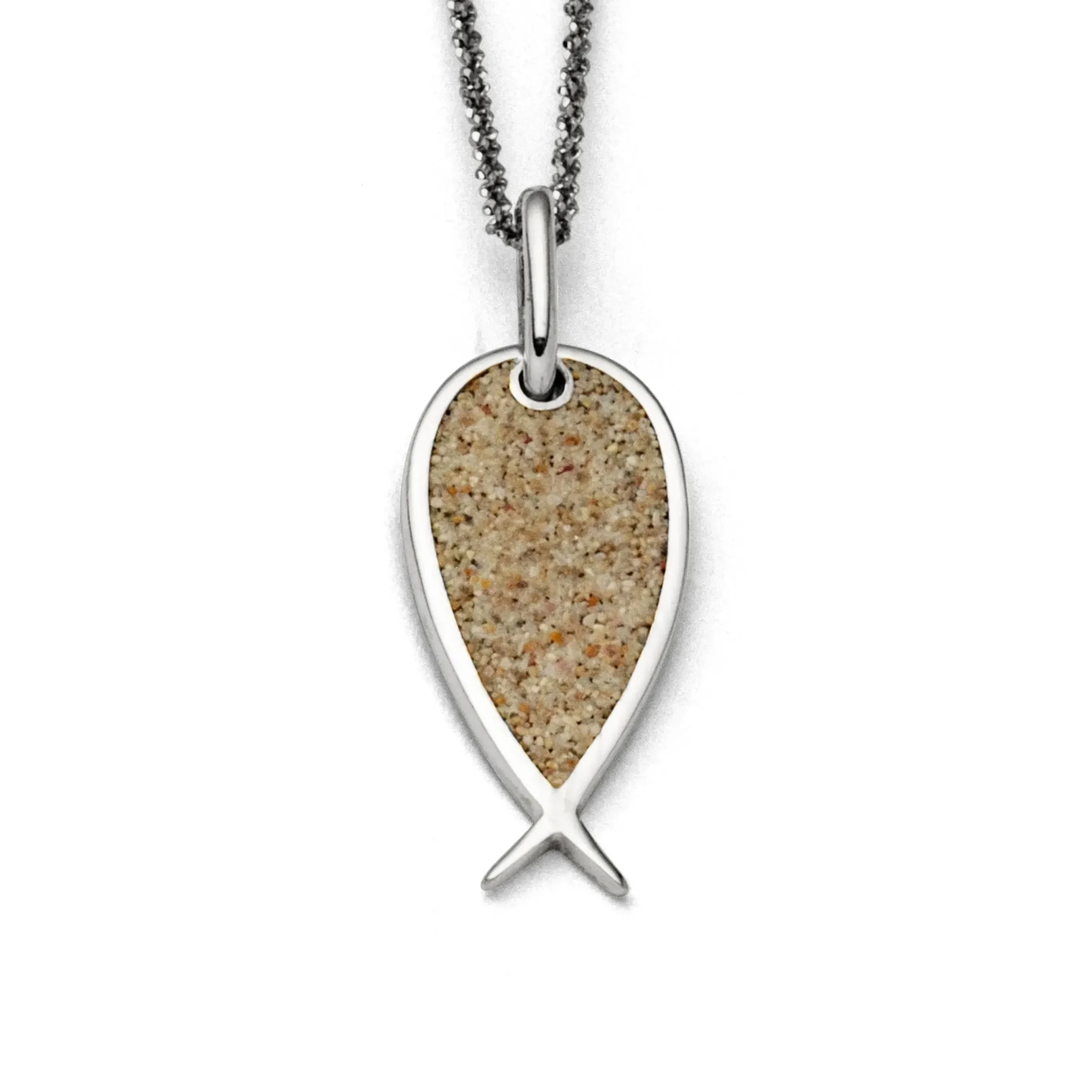 Anhänger „Fisch“ Anhänger in Fischform, gefüllt mit Strandsand, aus rhodiniertem 925er Sterlingsilber.
