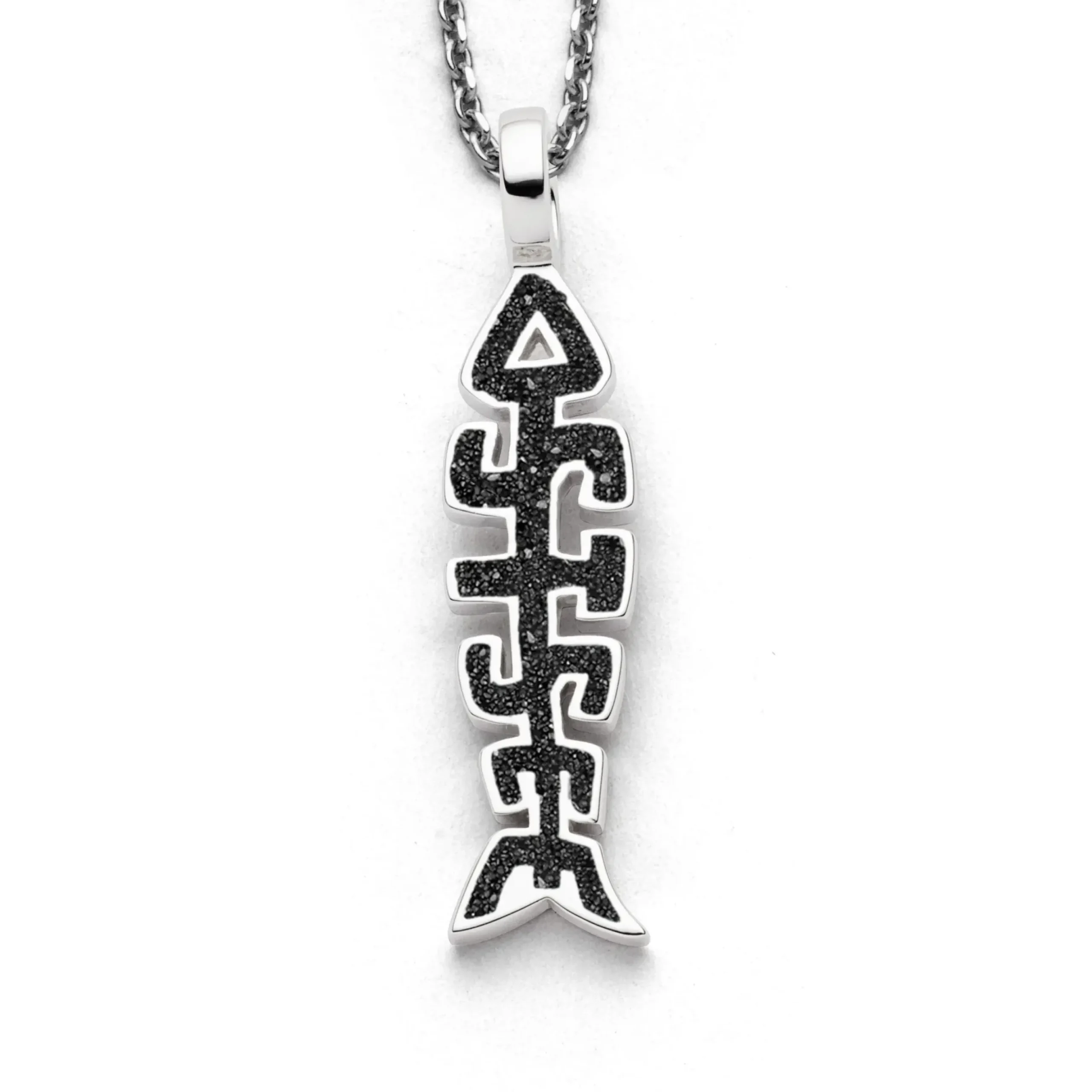 Anhänger mit „Ostsee“- Schriftzug in Fischgräte, gefüllt mit Lavasand und alles aus poliertem, rhodiniertem 925er Sterlingsilber.