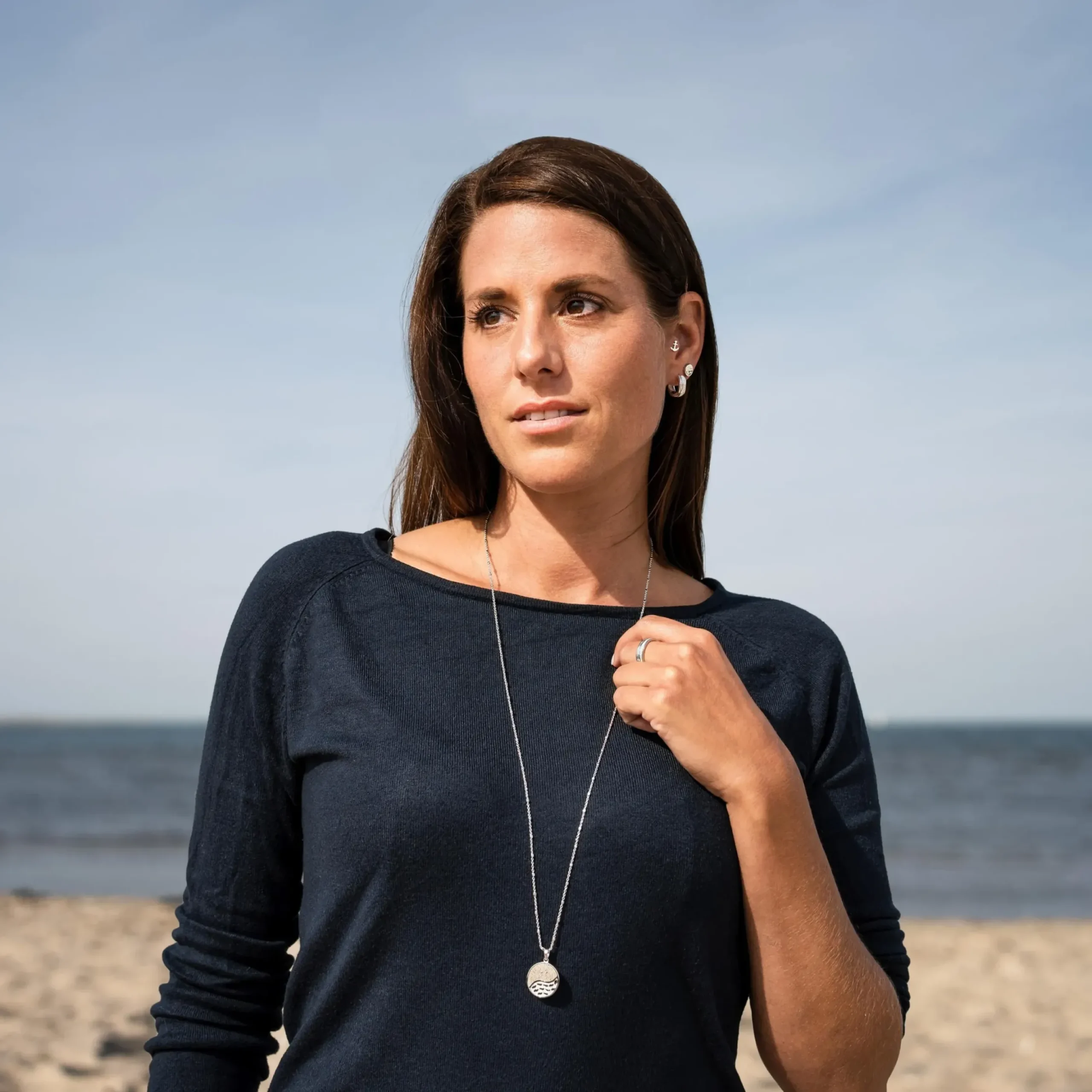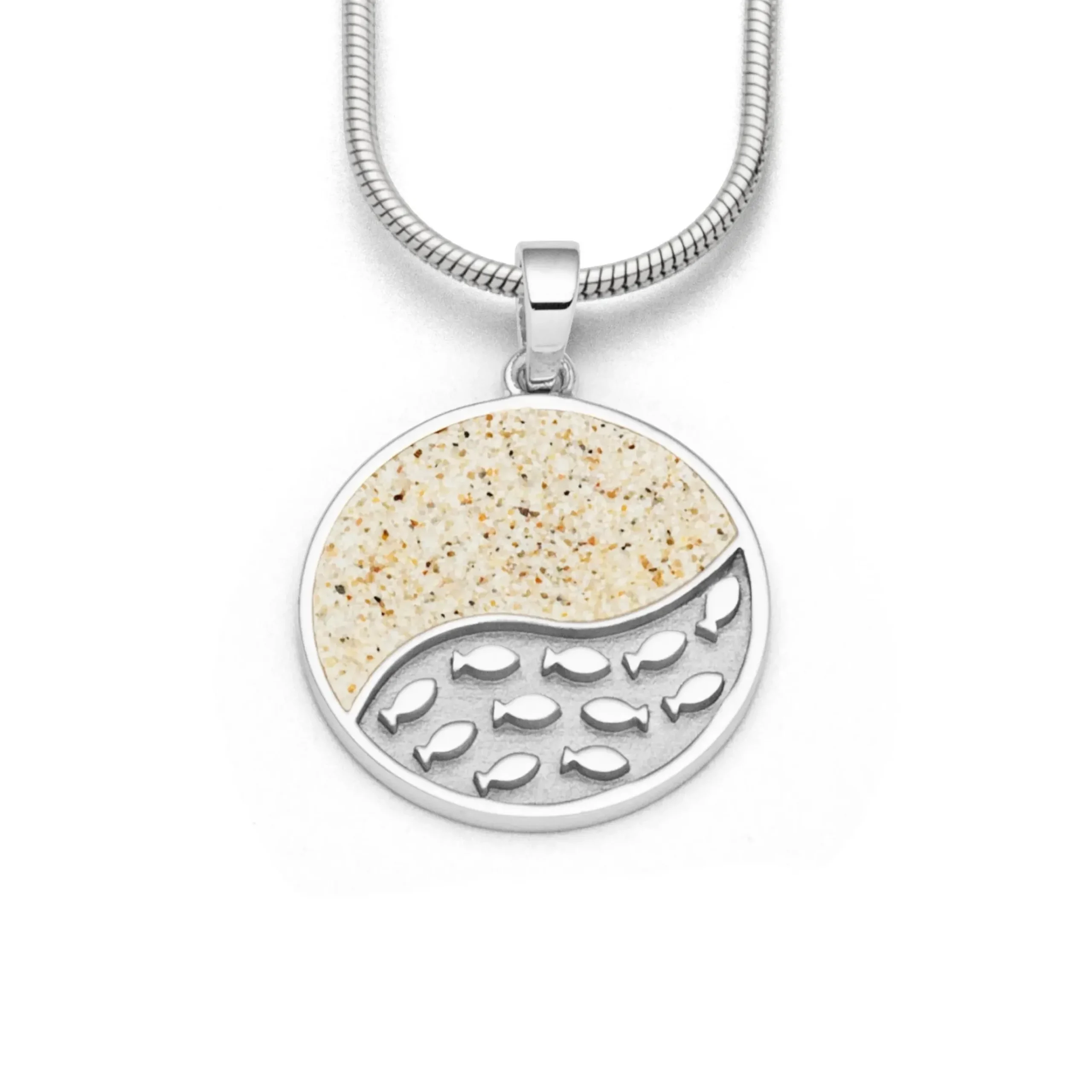 Runder Anhänger „Fischschwarm“ mit einer Welle, der obere Teil ist mit Strandsand gefüllt, der untere besetzt mit einem silbernen Fischschwarm innen sandgestrahlt, alles gefasst in poliertem, rhodiniertem 925er Sterling-Silber.