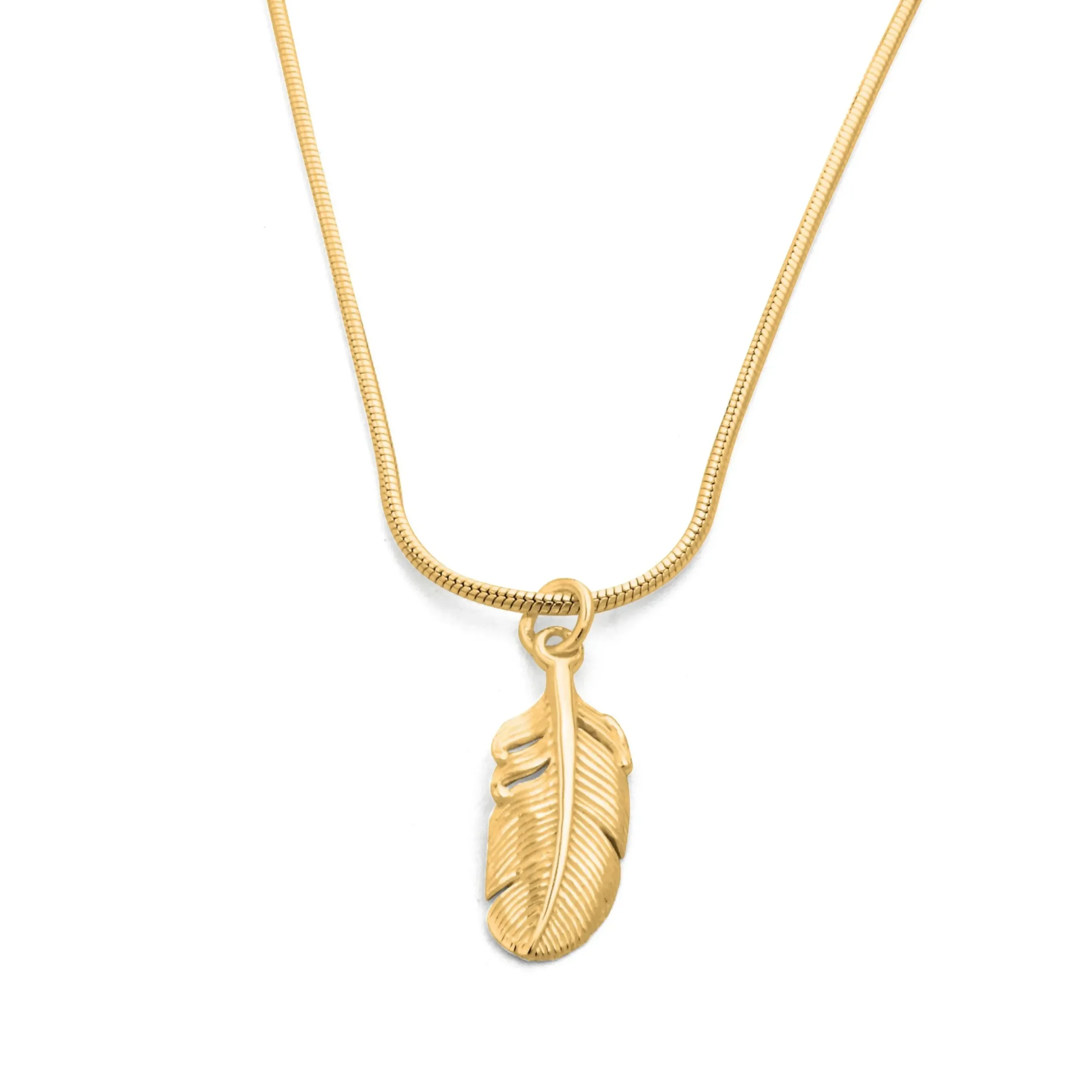 Anhänger „Feder“, mittelgroß, aus poliertem,vergoldetem 925er Sterling-Silber. Einzeln tragbar oder als Kombination mit anderen Schmuckstücken.