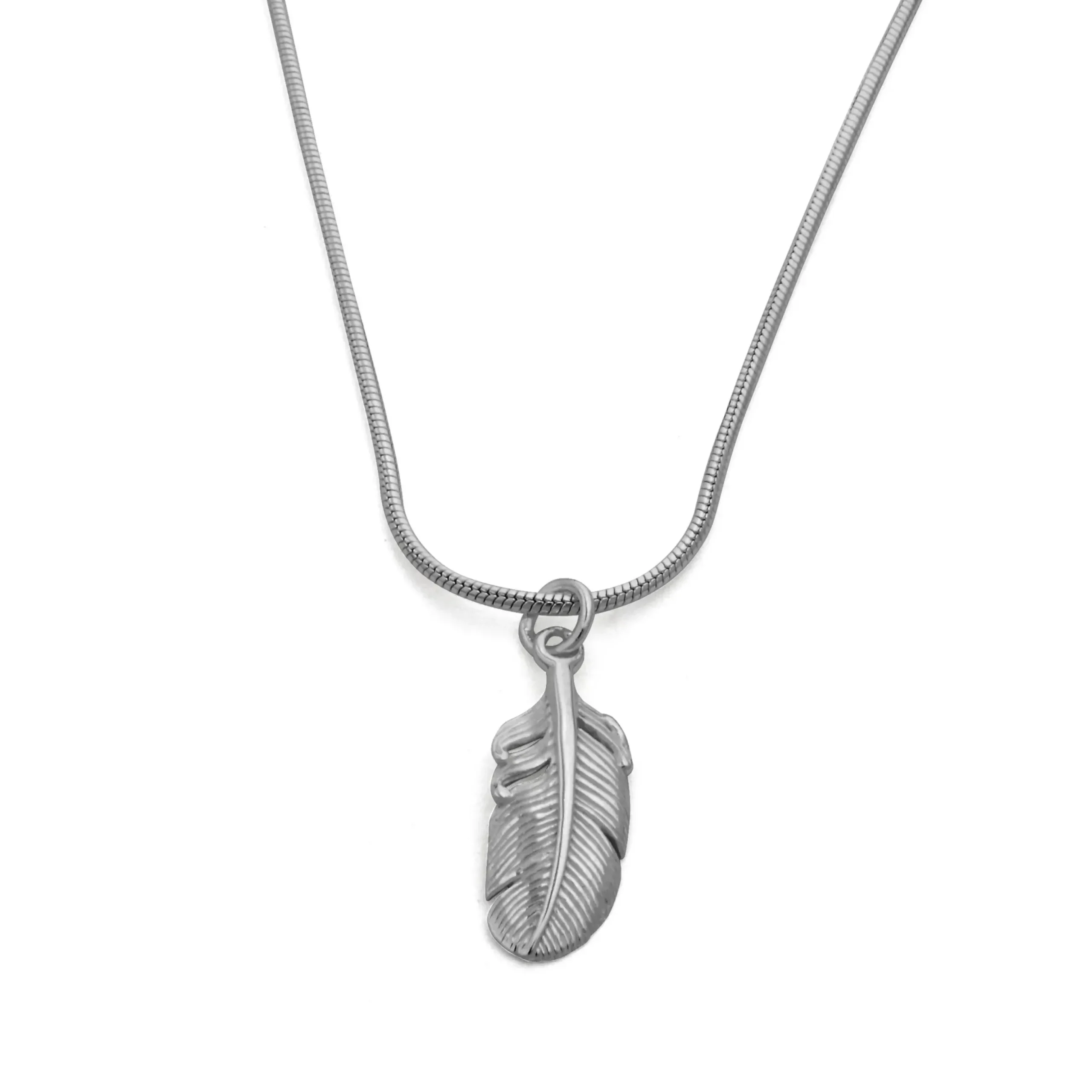 Anhänger „Feder“, mittelgroß, aus poliertem, rhodiniertem 925er Sterling-Silber. Einzeln tragbar oder als Kombination mit anderen Schmuckstücken.